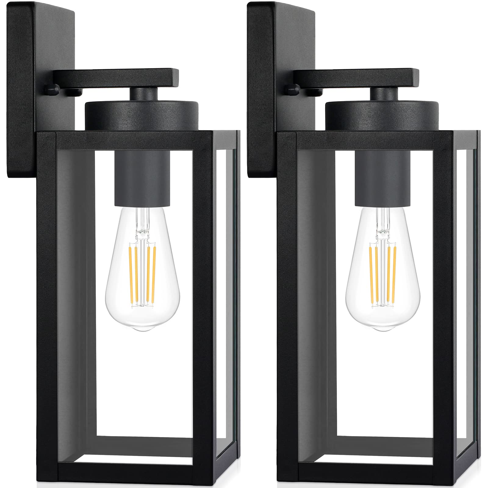 Outdoor Wall Light Fixtures, Exterior Waterproof Lanterns, Porch Sconces Wall Mounted Lighting with E26 Sockets & Glass Shades, Modern Matte Black Wall Lamps for Patio Front Door Entryway, 2-Pack