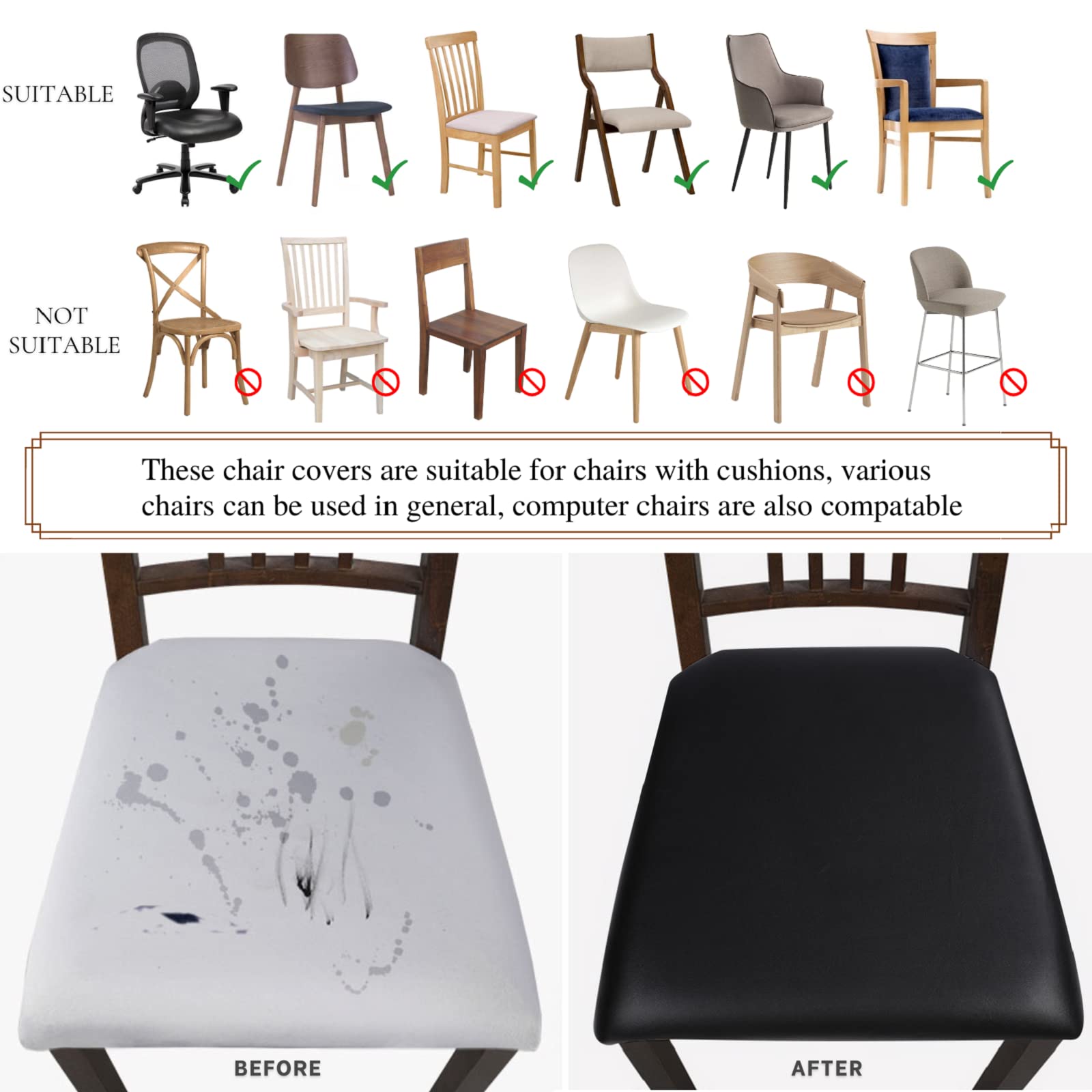 - 【Waterproof Chair Covers】SearchI dining seat cover is a very easy and fairly affordable solution to give your beloved chair protection. The PU leather fabric features excellent waterproof characteristics, which can fully protect your seat chairs from water soup or other fluid stains. Also, the chair seat slipcovers can protect your chairs from stains, dirt, bites and hairs of pets.
