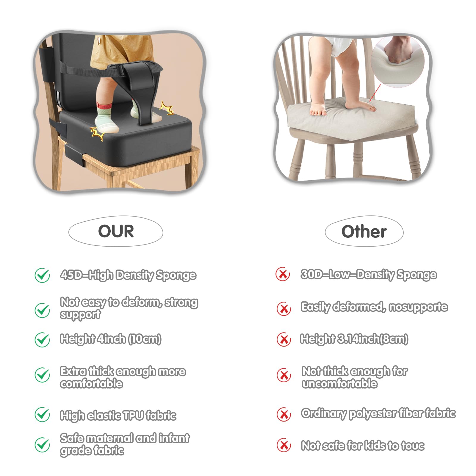 - Highlight 1 - Material upgrade: The toddler booster seat for dining table is filled with 45D high-density sponge commonly used in sofas, which has better support and load-bearing capacity than most 30D sponges on the market, and is not easy to deform even if the baby sits for a long time. The outer protective cover is made of high-elastic TPU film, which is more wrinkle-resistant than ordinary PU leather and is an excellent fabric for maternal and child products