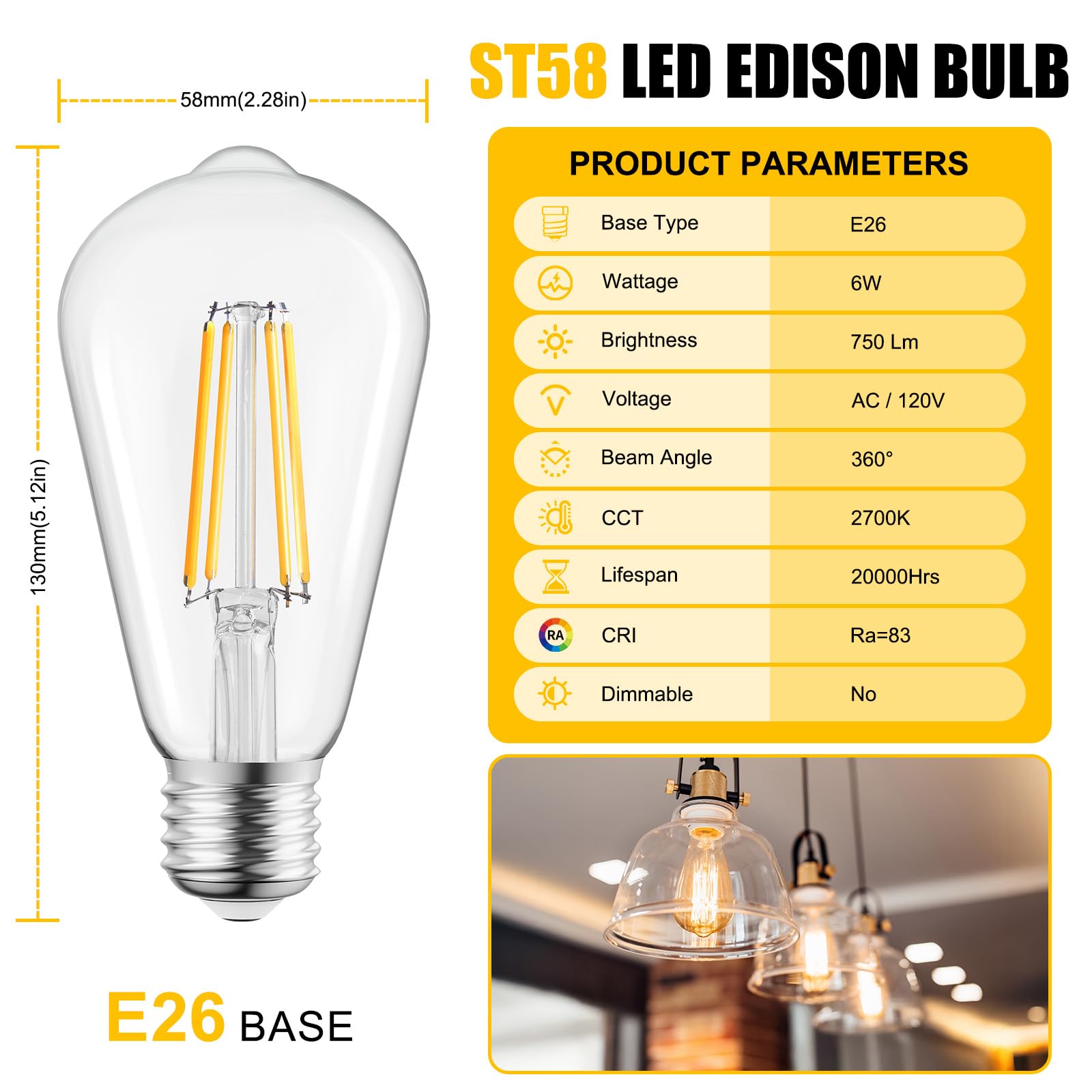 • Long-Lasting and Energy-Efficient: With an average lifespan of 20,000 hours and a lumen maintenance factor over 90% after 6,000 hours, LED filament bulbs replace 60W incandescent bulbs with 6W LED, saving over 95% on your electricity bill