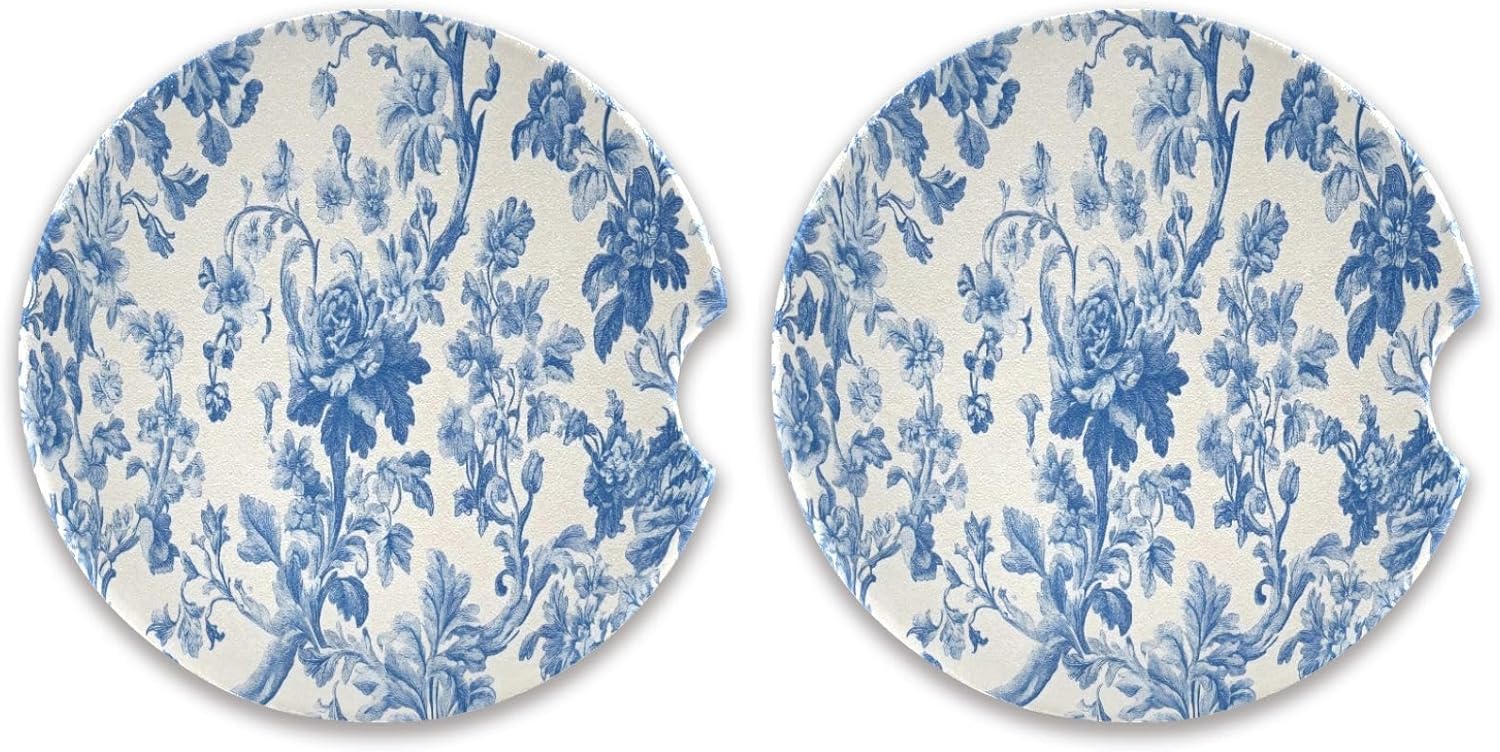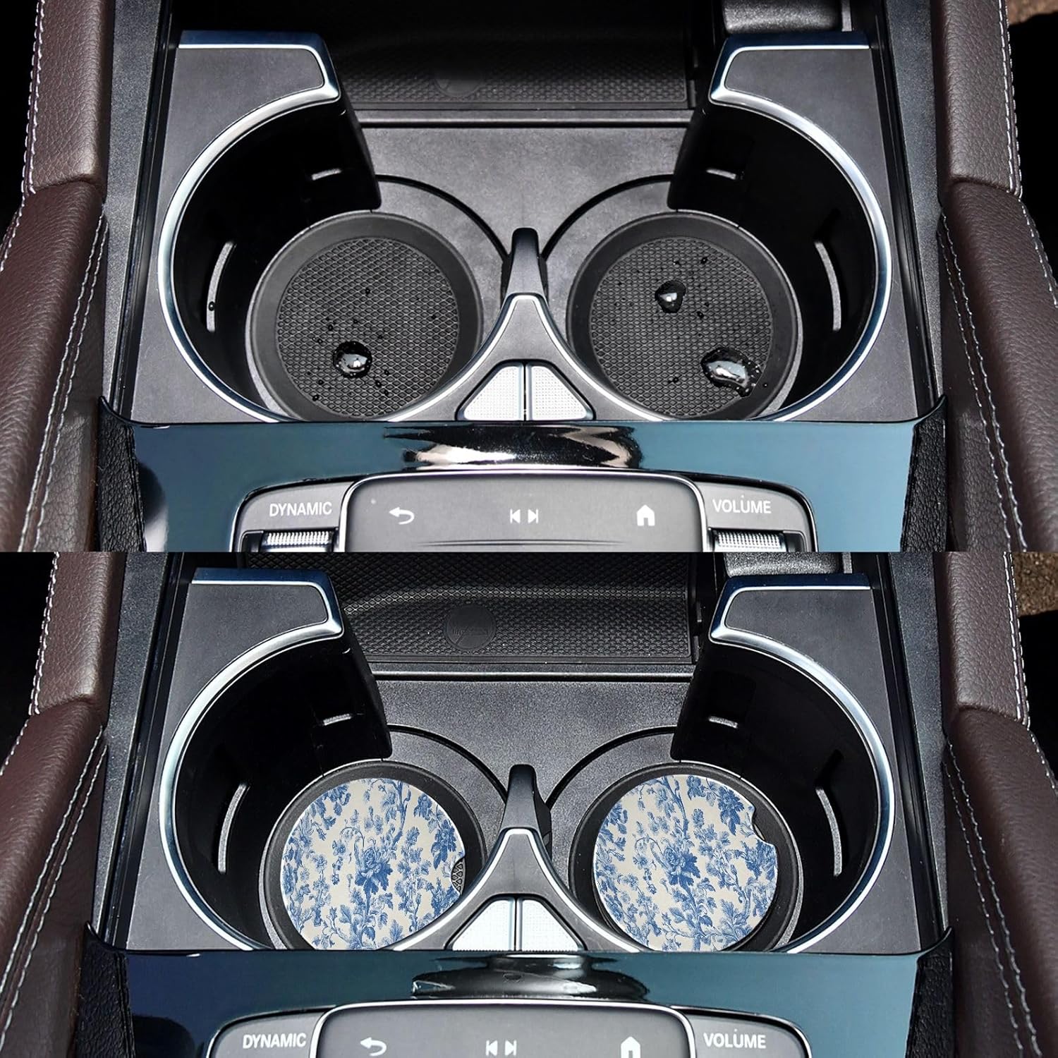 Car Cup Coaster 2 Pack Absorbent Car Coasters for Drinks Blue Flowers Ceramic Cup Holder with Finger Notch for Women and Men 2.5 inch Car Interior Accessories