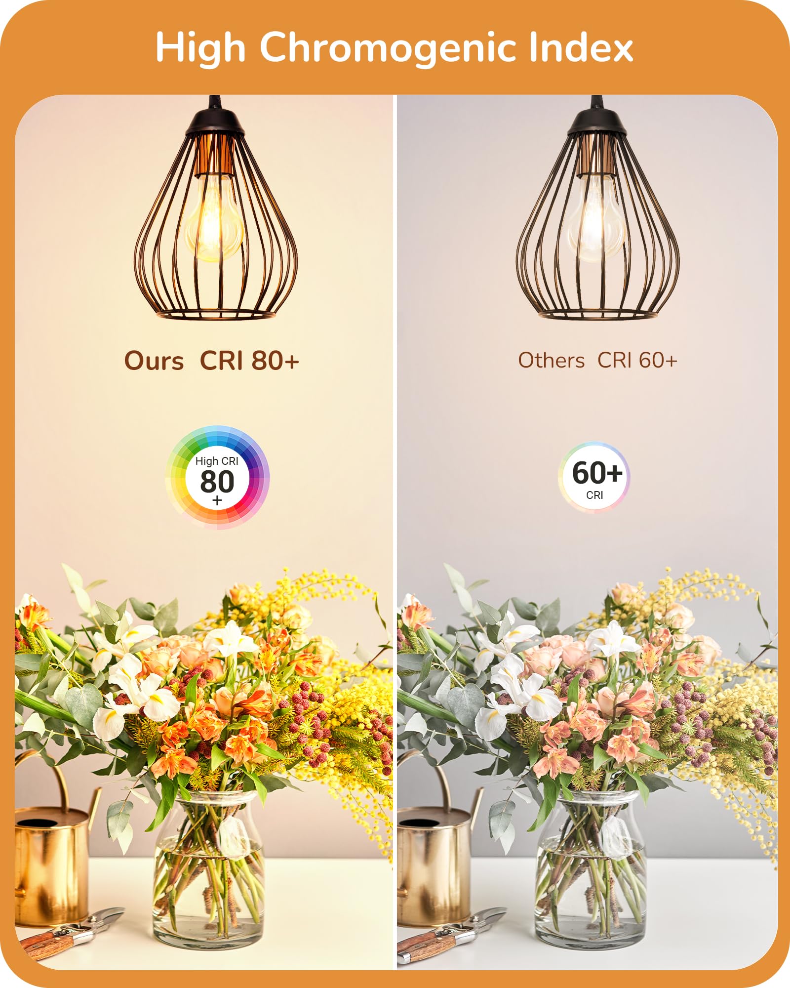 - [Warm Amber Glow & CRI 80+] Combining a 2200K filament with amber glass, the vintage LED light bulbs emit a warm, soft glow, creating a cozy atmosphere; 240-degree light angle with 80+ CRI enhances the true colors of your space, making your space vivid and lively