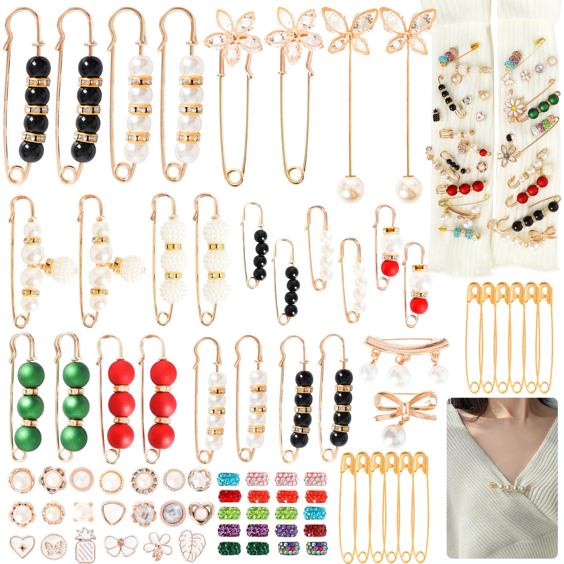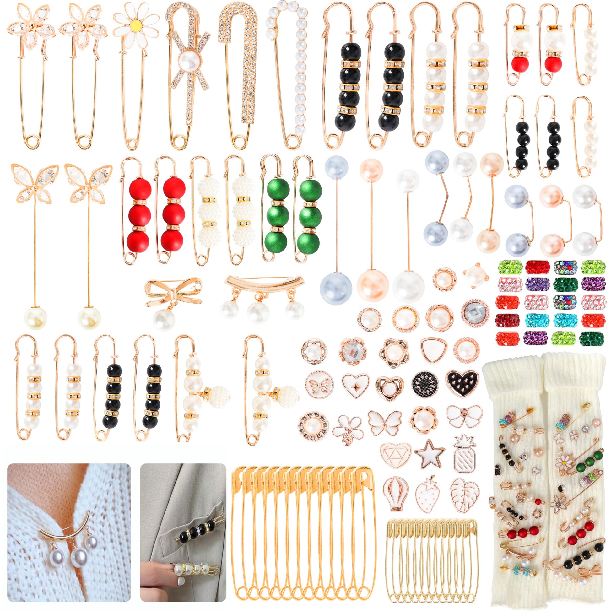 Gold Brooches Pins Charms for Socks: LOTOFUN Fashion 12,80,110PCS Rhinestone Pearl Bling Junk Sock Bulk Button - Decorative Safety Pins Brooch for Women Shoes Clothes Sweater Hat Pant