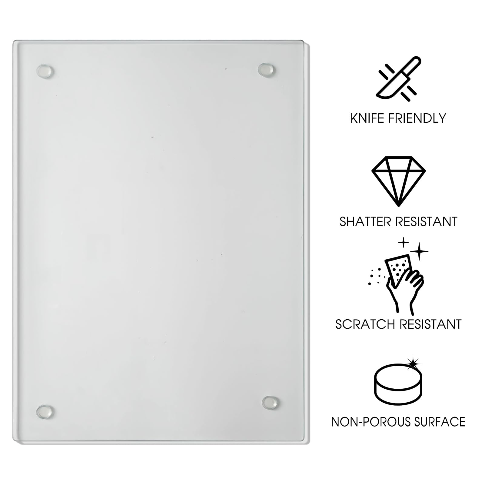 - ✅Safe And Anti-Slip : This tempered glass cutting board has polished edges that won't hurt your hands.The bottom of the glass cutting board has four non-slip pads that keep it stable on your kitchen countertop while you chop vegetables, meat, and more. Rubber feet ensure the glass cutting board won't slip or slide around while in use.