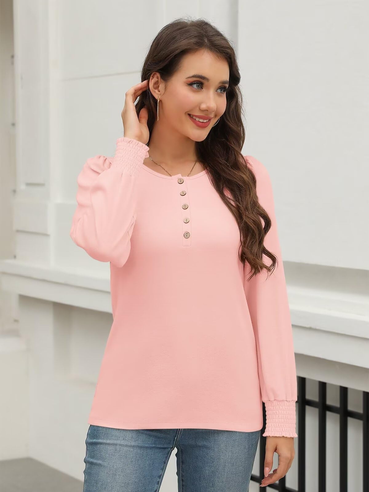 Minetom Women's Long Sleeve Henley Tops Smocked Puff Sleeve Tops Casual Shirts Blouses Pink