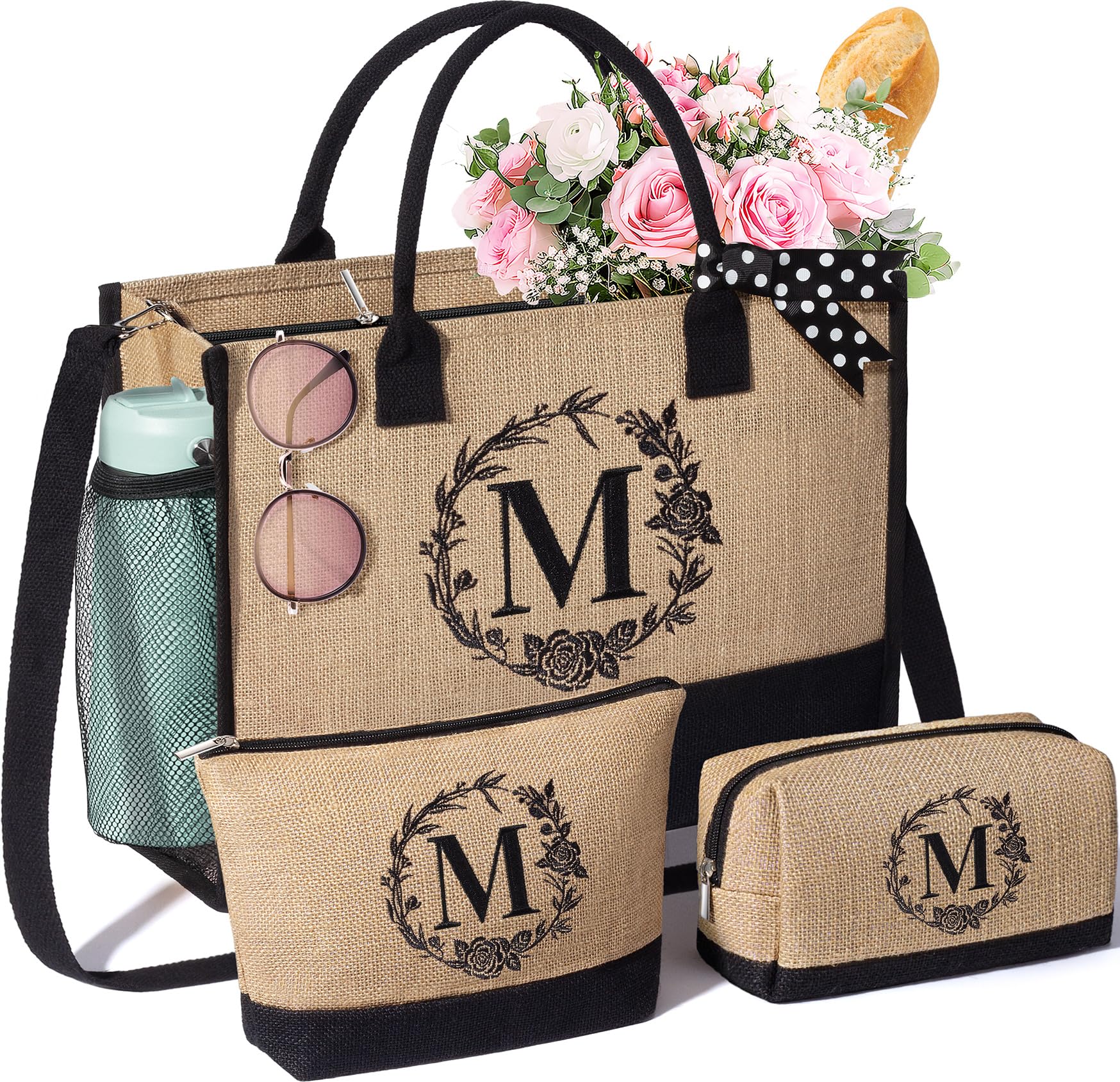 Personalized Gifts for Women Tote Bag, Initial Jute Tote Bag & Makeup Bags Monogrammed Beach Bag w/ Zipper, Birthday Gifts Mothers Day Gifts for Mom Women Her Friend Sister Wife Grandma Teacher Nurse