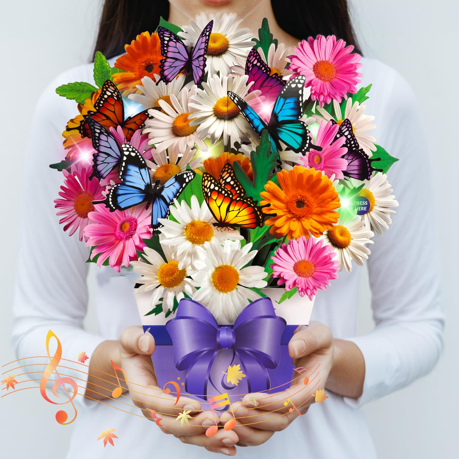 Pop Up Card with Music and Light, Anniversary Card with Roses, Flower Bouquet 3D Gift Card, Birthday Valentines Day Gifts Mothers Day Gifts for Women Mom Wife(Rose)
