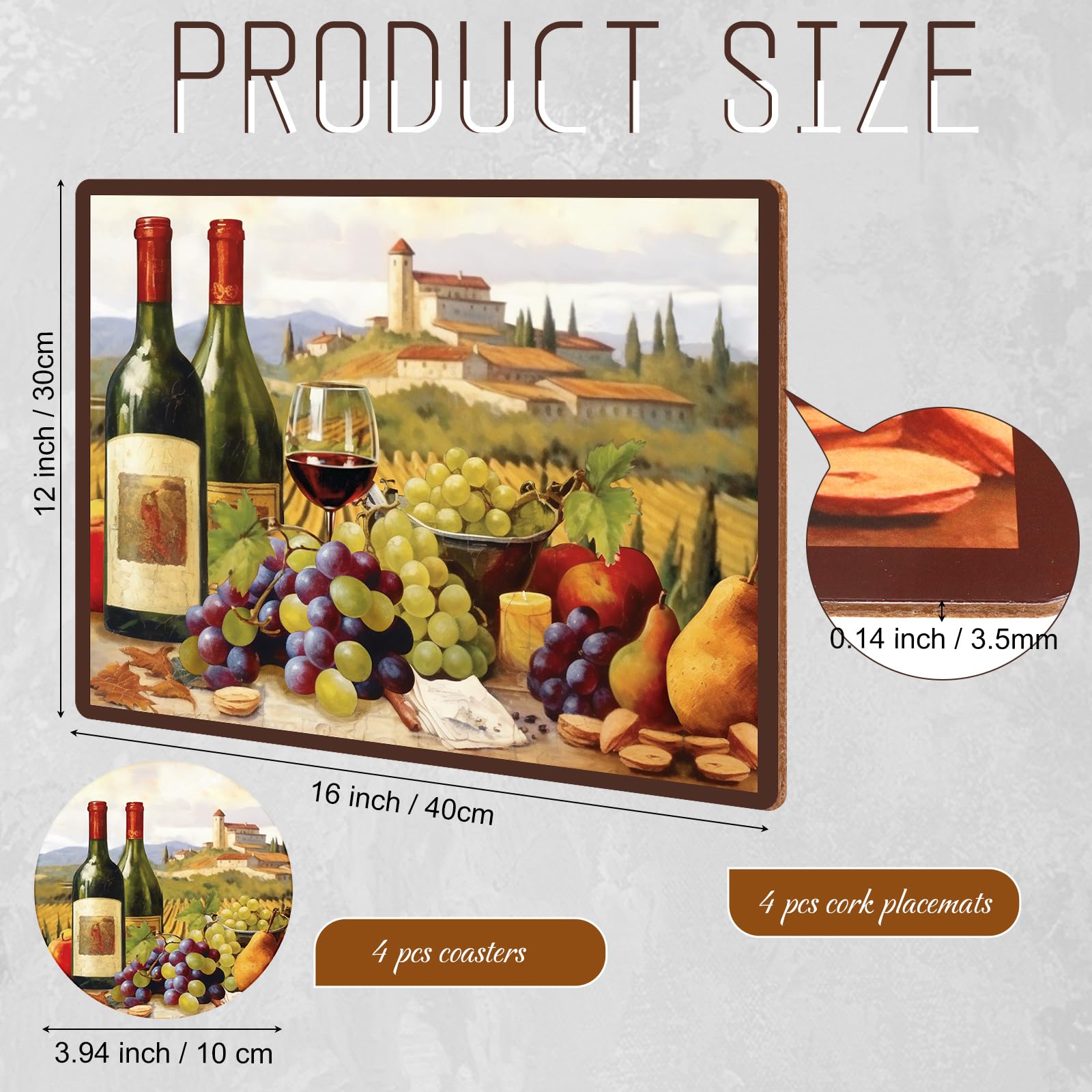- Suitable Size: Each cork backed table mat is about 12 x 16 inch / 30 x 40 cm while the diameter of the cork coasters is about 3.94 inch / 10 cm. Whether it is round table or rectangular table, these wine cork placemats sets will match well while brings a touch of traditional elegance to your kitchen or dining room