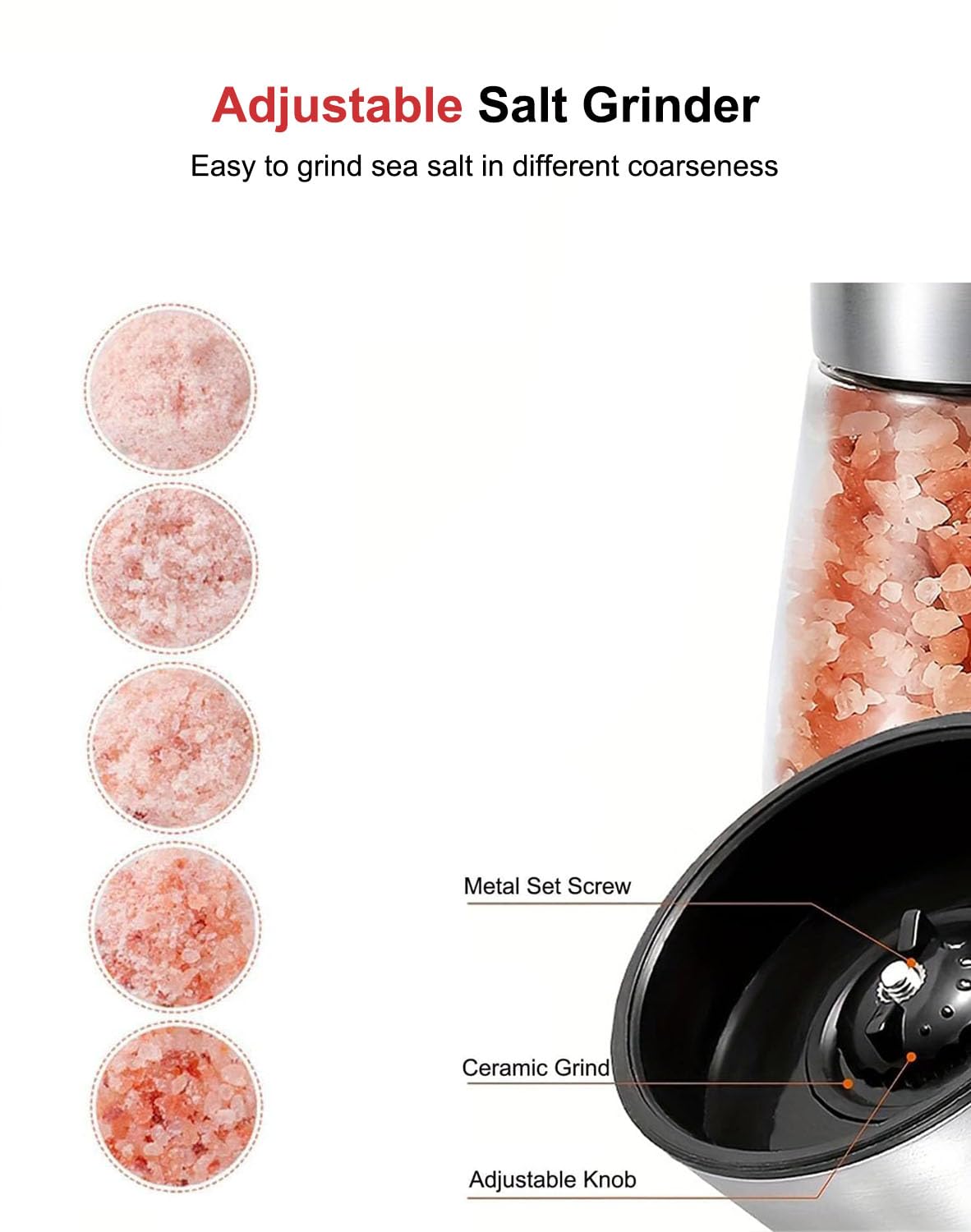 - [Practical Design & High-Quality Materials] TooWoom Salt and Pepper Grinders Set feature food-grade transparent glass for safety and easy refilling. The visible design lets you see when it's time to add more pepper or sea salt. The stainless steel grinder cap is rust-proof, scratch-resistant, and durable for long-lasting use.