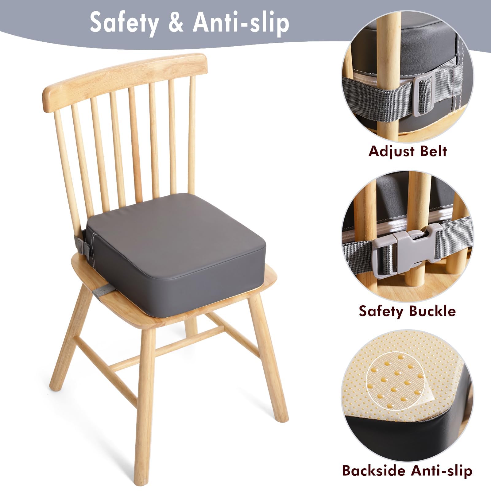 - 【Dual Safety & Non-Slip】- Booster seat for dining table has two safety belts on the cushion, which can be fixed on the back and bottom of the chair, and there is anti-slip silicone at the bottom of the cushion to ensure that the booster seat is fixed and does not move or slide off. Your baby will be very safe and stable during mealtime or any other activity at the kitchen table.