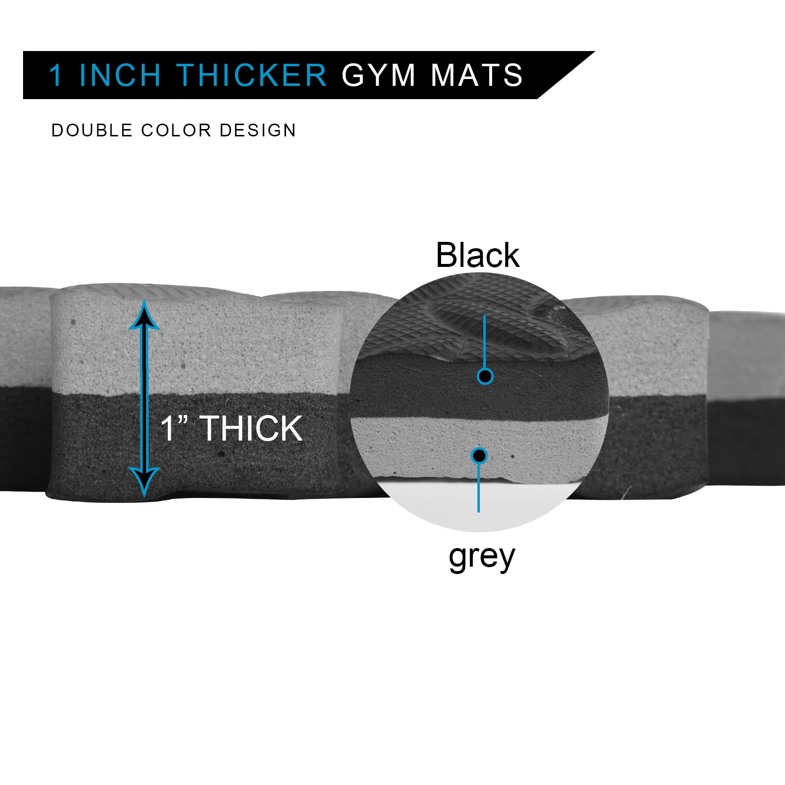 - đ„ăThicker 1' Exercise Gym Matsă Twice thickness of other Puzzle Exercise Mat on the market. The 1 Inch High-Density EVA Foam can reduce noise and vibration better, so you can exercise at ease and won't disturb your family and neighbors.
