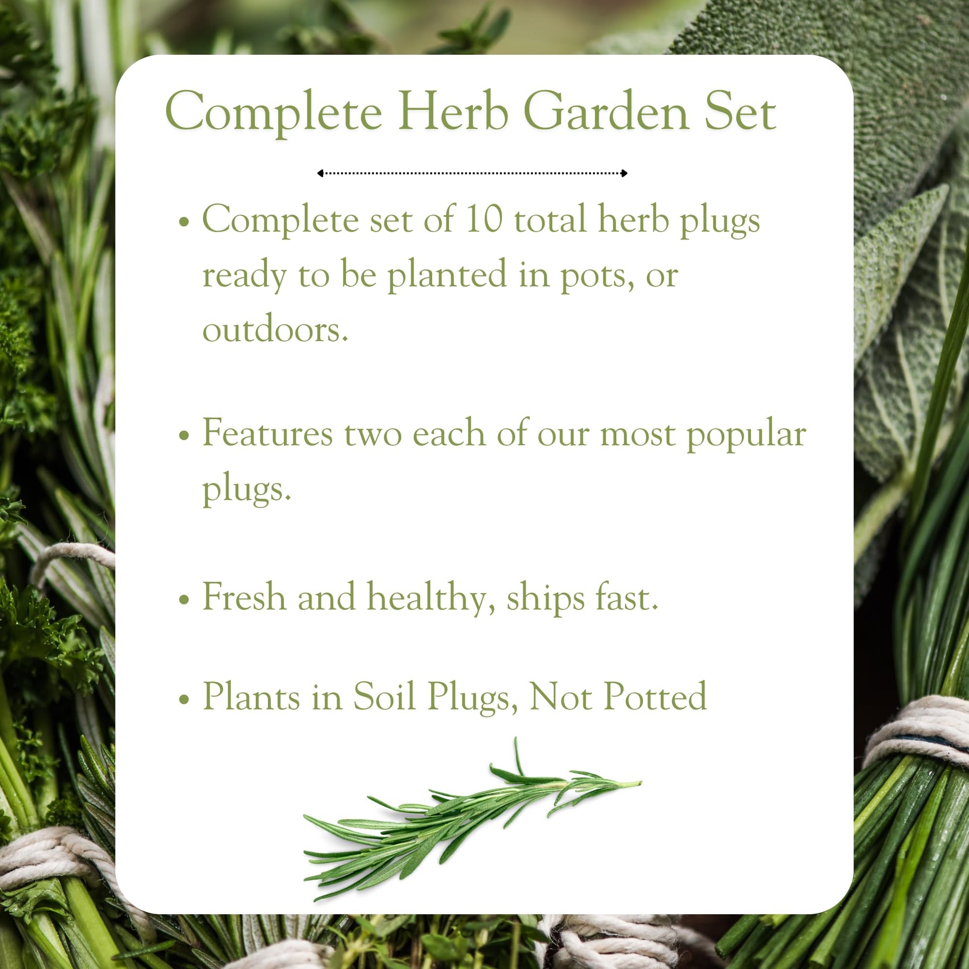 Details: Grow your own fresh herbs effortlessly with our 10-pack herb garden soil plugs! These pre-rooted 3” plugs include a carefully selected mix of essential culinary herbs: Sweet Basil (Large Leaf), Peppermint, Oregano, Sage, and English Thyme – with two of each variety. Perfect for indoor and outdoor gardening, these living herb plugs are ready to be planted upon arrival. Whether you're a seasoned gardener or a beginner, simply place them in pots, a raised bed, or directly in your garden and enjoy fresh herbs all year long. Ideal for cooking, teas, or drying for future use, these herbs will bring incredible flavor and fragrance to your home. These soil plugs are a convenient and reliable way to start a thriving herb garden without the hassle of seeds or waiting for germination. Simply plant, water, and enjoy!
