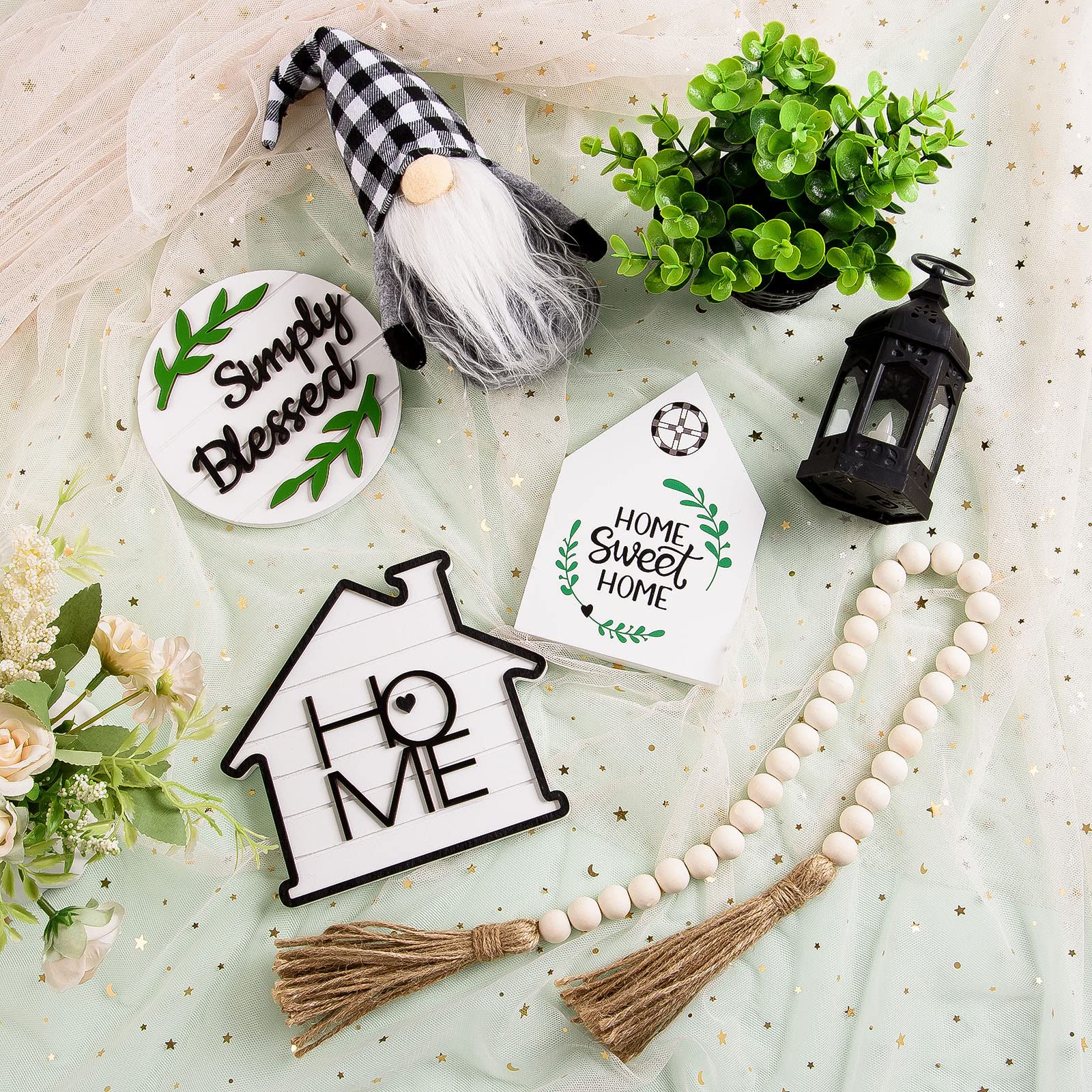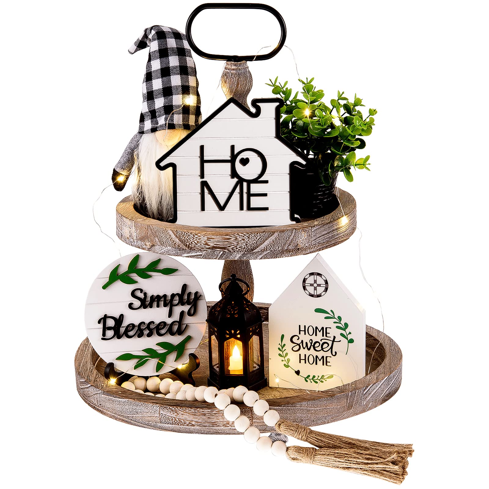 - Ideal tiered tray decors set: Including 1 x 'sweet home' wood sign, 1 x 'simply blessed' wooden sign, 1 x 'home' wooden sign, 1 x black white buffalo plaid gnome,1 x wooden bead garland, 1 x artificial succulent potted plant, 1x warm white LED string light, 1 x mini candle lantern and 2 x plastic stands, enough kinds of decoration items can be matched with layered trays to make your home more attractive. Please note: the tiered tray is not included