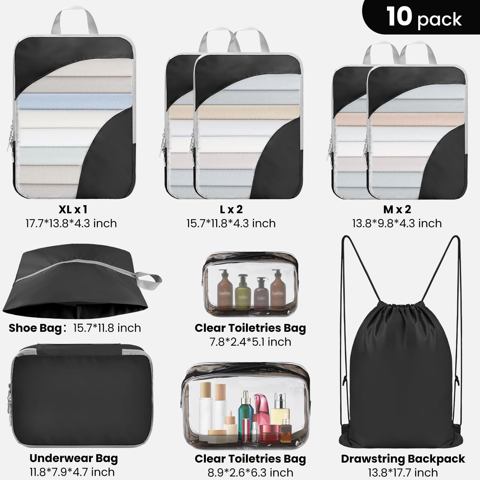 10 Set Compression Packing Cubes, Lightweight Travel Essentials, Stretchable Expandable Storage Bags, Compression Bags for Travel Accessories Luggage Storage Set (10 Pcs, Black)