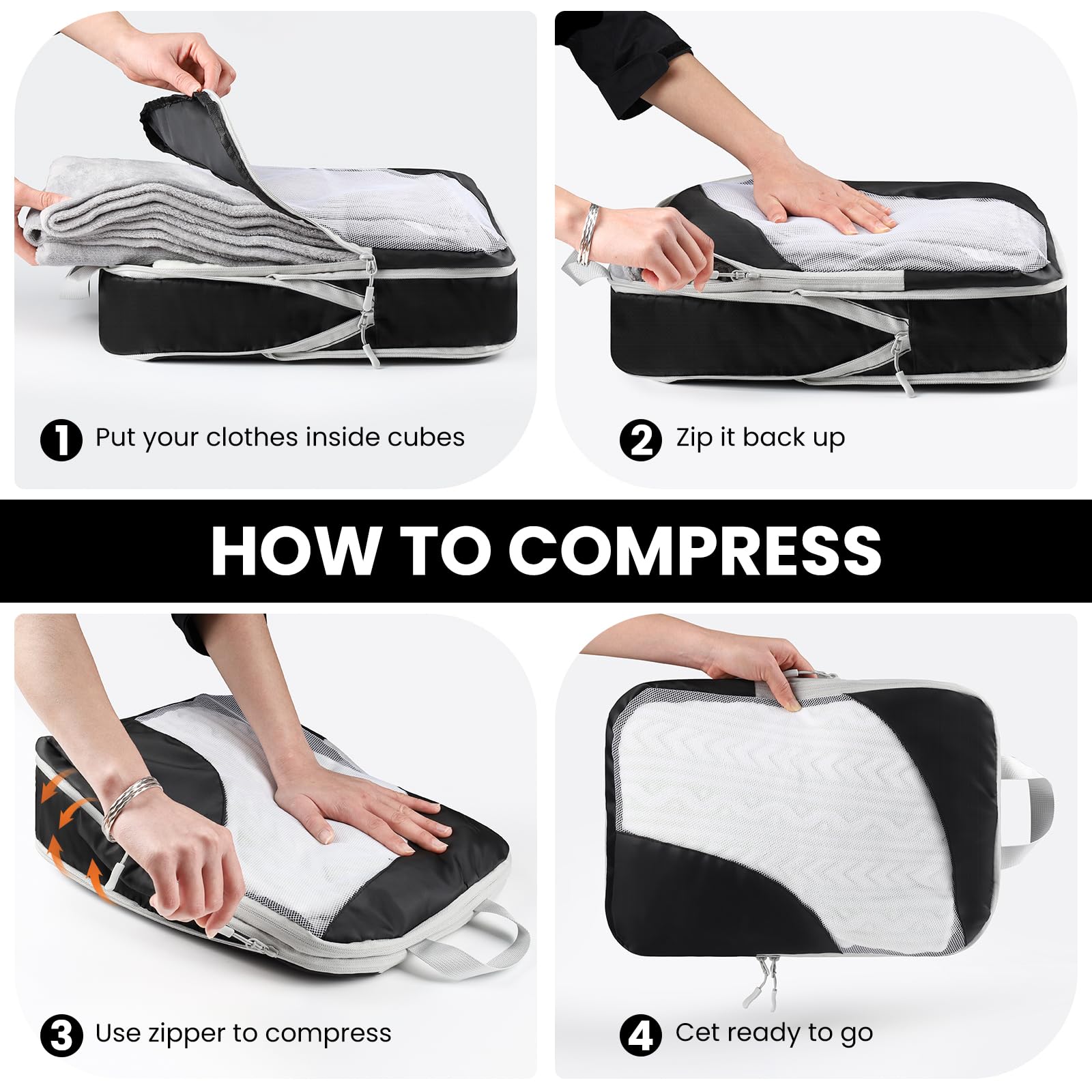 - SAVE 60% OF SPACE: With our compression travel bags, you can easily compress your clothes and other essentials into a compact shape, freeing up to 60% of space in your luggage. Imagine being able to fit twice as much stuff in your suitcase without compromising on style or comfort. Premium sturdy and smooth double way zipper with extended cord ensure fast and easy opening and closing of the packing cubes