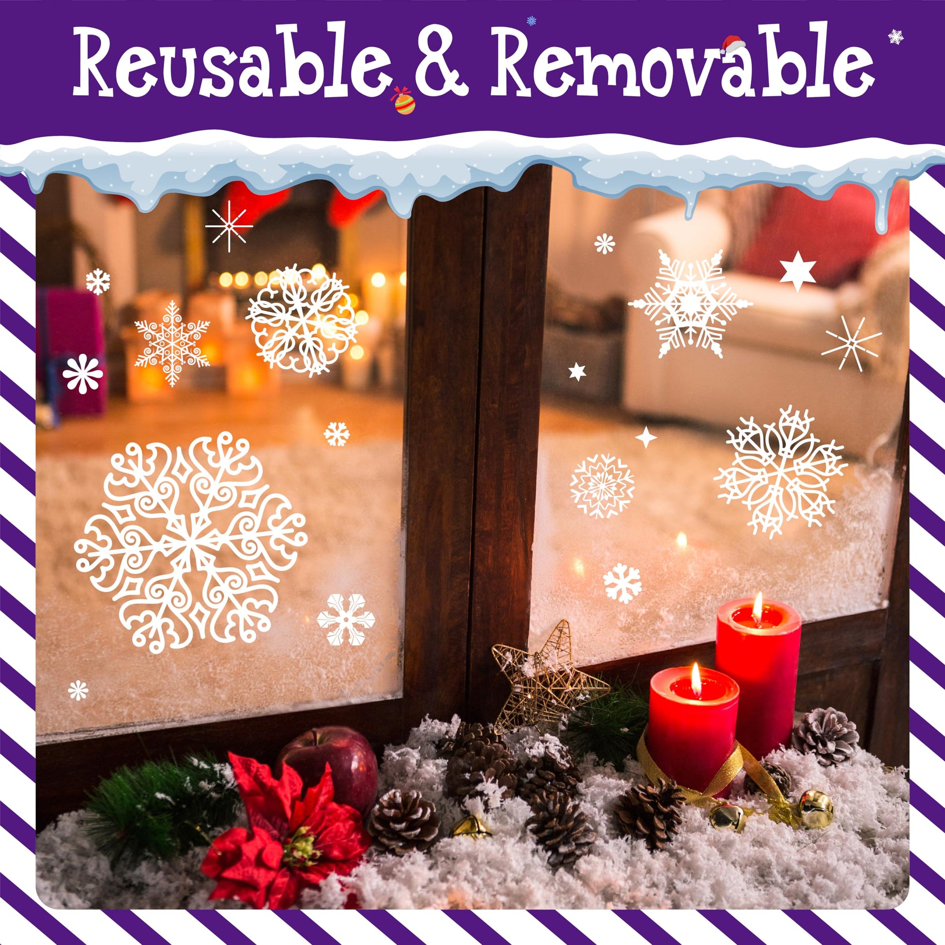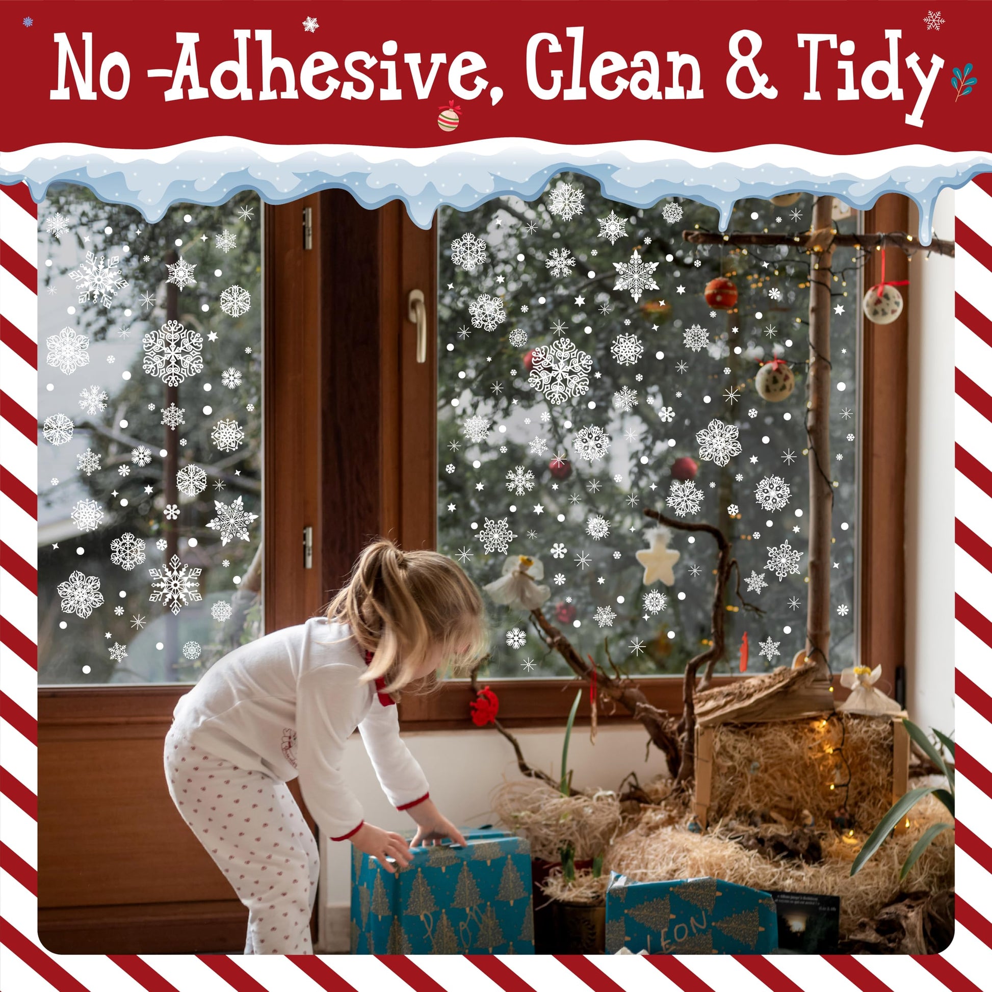 - DOUBLE SIDED: The Xmas window decals are made of static PVC material, which has strong stickiness and no residue left. The window clings can be enjoyed both indoor and outdoor with double sided design. Stick it to your windows or glass door, people inside and outside could appreciate your decoration clearly, and immerse in a strong festive atmosphere.