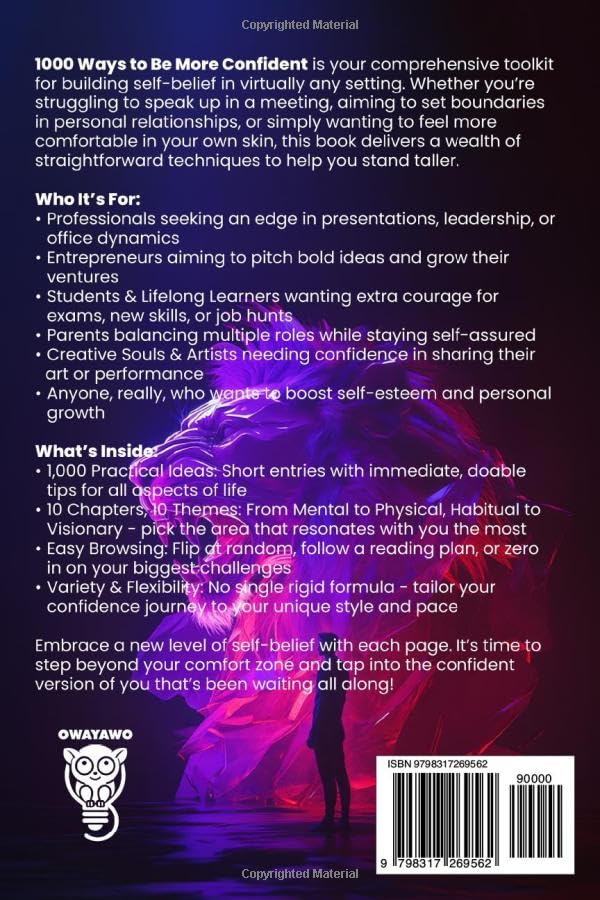 Whether you’re seeking that extra push to speak up at work 💼, looking to develop a bolder social life 💬, or simply wanting to feel more at ease in your own skin 🌈, 1000 Ways to Be More Confident is your roadmap to lasting self-assurance.