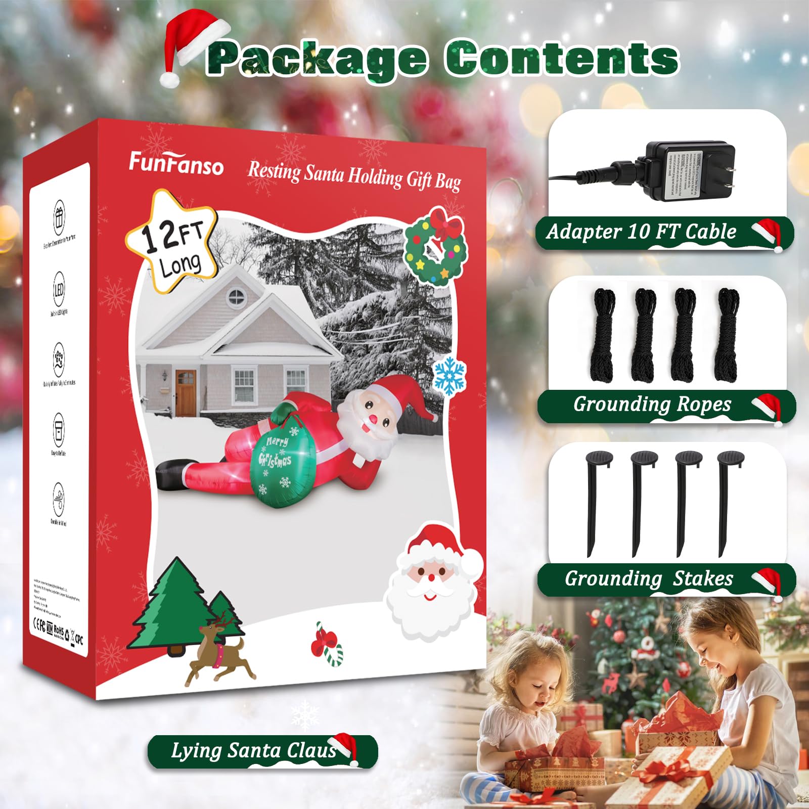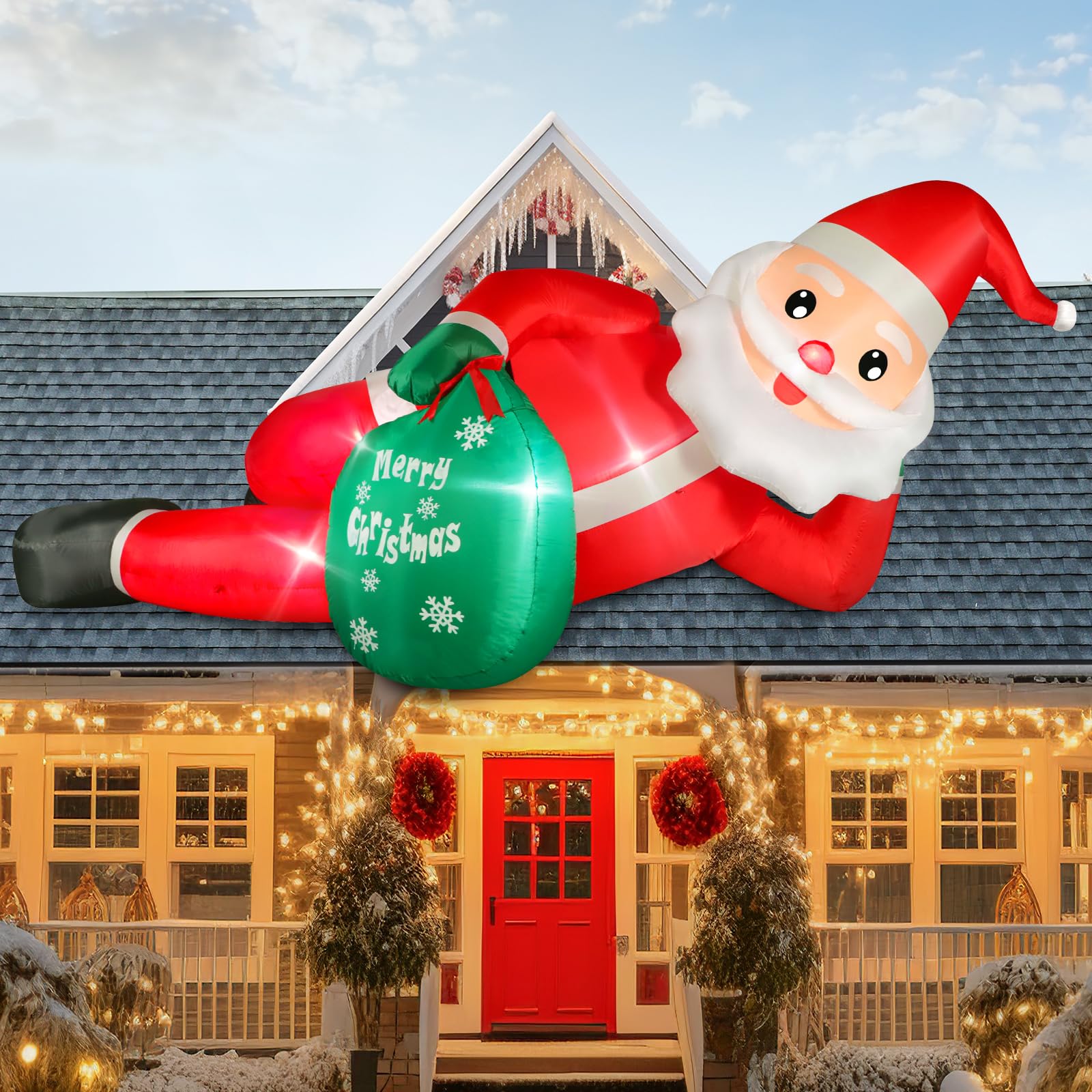 - ๐ ใ๐๐ฎ๐-๐๐๐ฉ๐๐๐๐ฃ๐ ๐ญ๐ฎ๐๐ใIt is not only a 12FT long lying Christmas inflatable santa claus outdoor yard decorations, but also a trigger of joy and imagination. The LED lights outline a kind outline at night, not only the friends are excited to gather around, even the passers-by stop for it. It is not only a decoration, but also a convergence point of laughter and blessings among neighbors, making your home both a dazzling and welcoming landmark in your community.