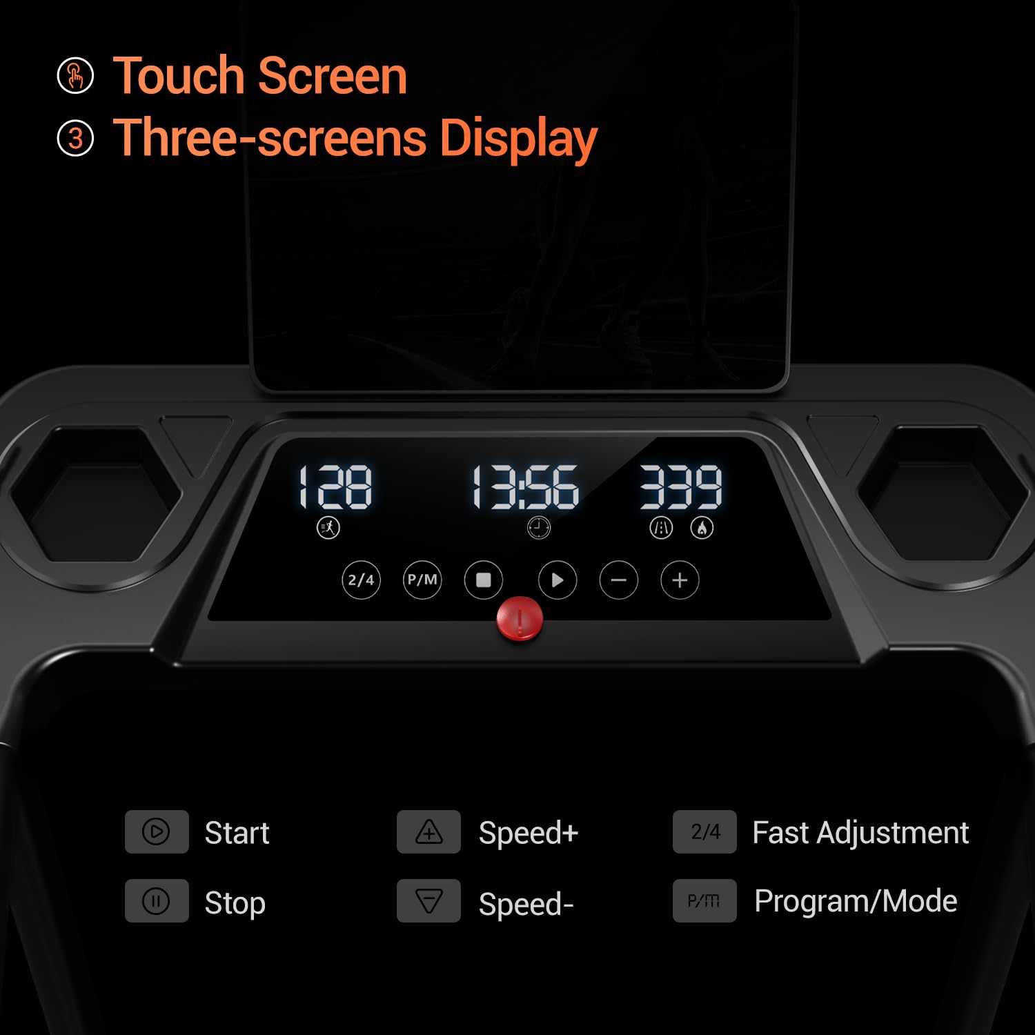 - 3-Screen Display & Foldable Design: This treadmill with handles features a triple display that shows time, speed, distance, and calories burned in real time and allows you to improve and adjust your workout program at any time with buttons on the display. This foldable treadmill has a built-in water cup holder and tablet/cell phone holder, making it easy for users to place their belongings while working out
