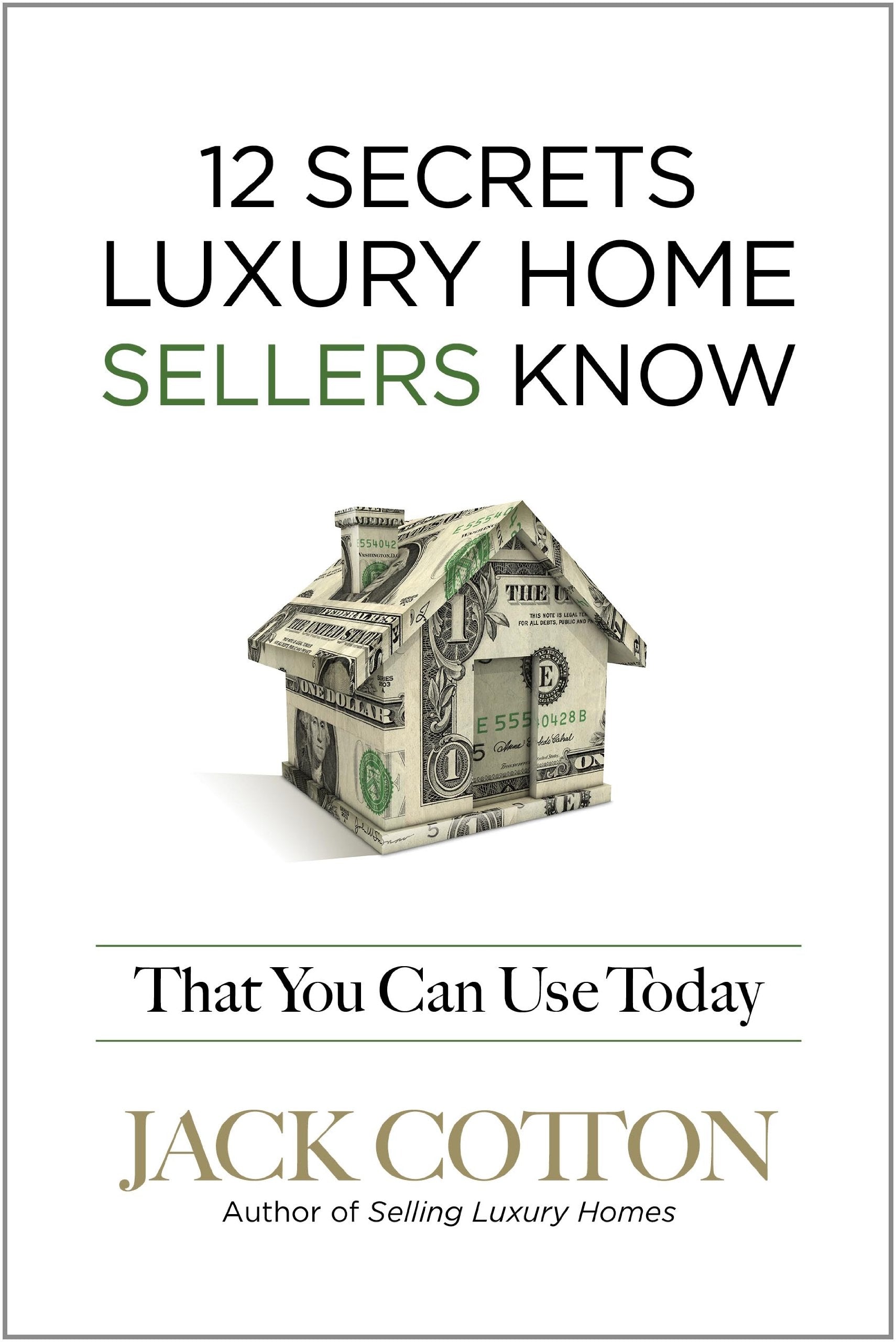 Details: What do the people selling that mansion know, that you don t know? Whether you re selling a primary or a vacation home, you can apply what wealthy homeowners know to sell your home in the shortest time, for the highest price, with the least aggravation. Take an inside look at the personal and financial habits of the people who buy and sell the kind of upscale homes that we all look at and long for. You can now systematically sell your home using the 12 secrets that work for luxury home sellers. Like its companion book 12 Secrets Luxury Home Buyers Know That You Can Use Today, this book shares the knowledge of those who have made their money the old-fashioned way with the good luck that comes through working hard and recognizing opportunity. Based on three decades of working with luxury home sellers, America s top luxury home expert Jack Cotton tells you how to: Prepare yourself mentally to sell the way luxury home sellers do; Ask the right questions, to hire the right agent, for the right reasons; Ask for marketing that will sell your home faster and for the highest price; Respect the time value of money, and understand why selling sooner rather than later can be more profitable; Create and use a staging checklist to present your home in the best possible light; Price your home to attract the buyers who will actually buy your home; Apply the three rules of luxury home seller negotiation and close the sale. 12 Secrets Luxury Home Sellers Know That You Can Use Today gives you 12 common-sense strategies to put into action immediately. Each chapter ends with specific steps you can take to reap the rewards of faster, smoother, and more profitable selling!
