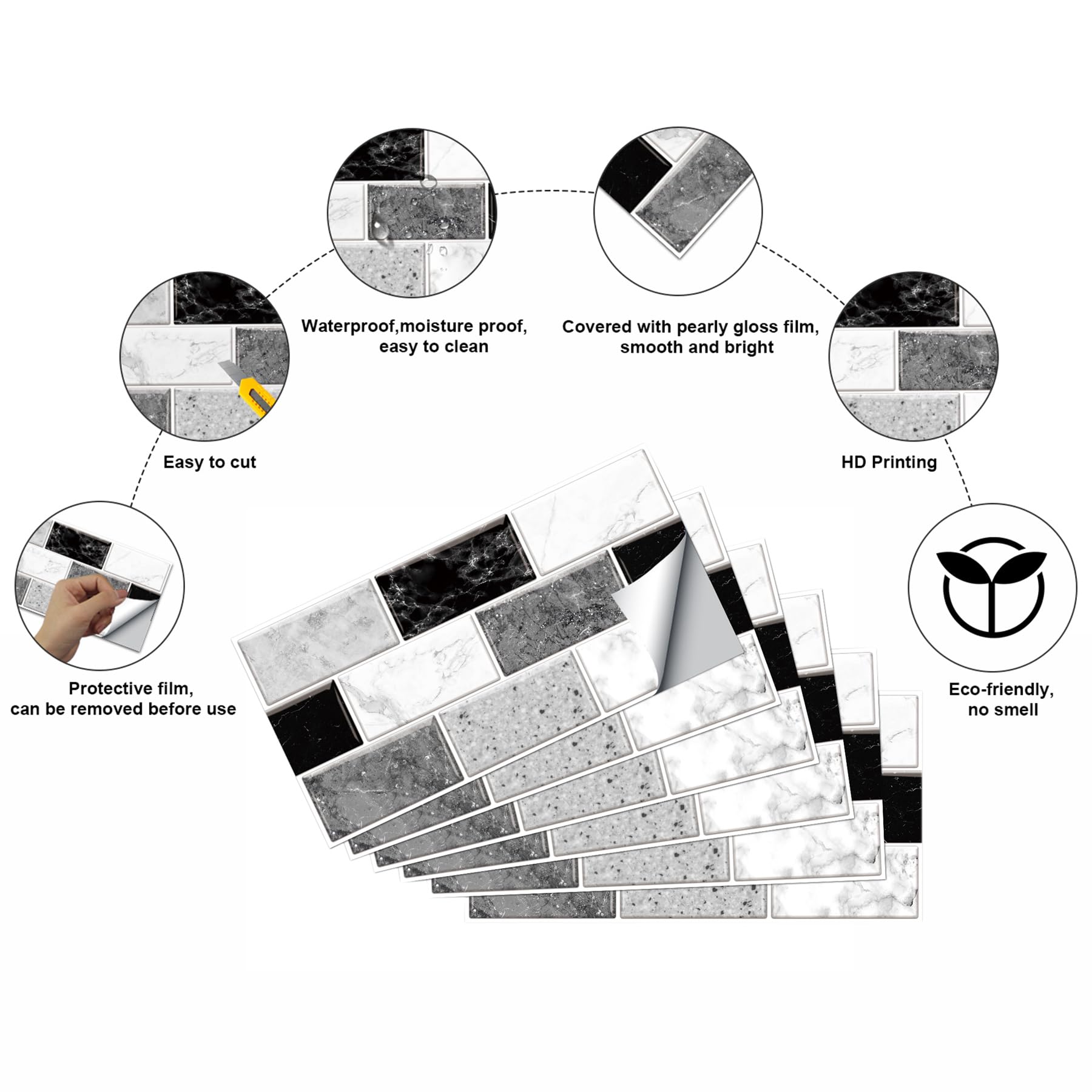 - 【Quality Materials】Our wall tiles peel and stick are made of high quality pvc, which resistant to heat, water, moisture and humidity. Easy to wipe down when splashed or dirty.It approved for kitchen backsplash,fireplace surround and wet area use,including showers,bathroom splashback.