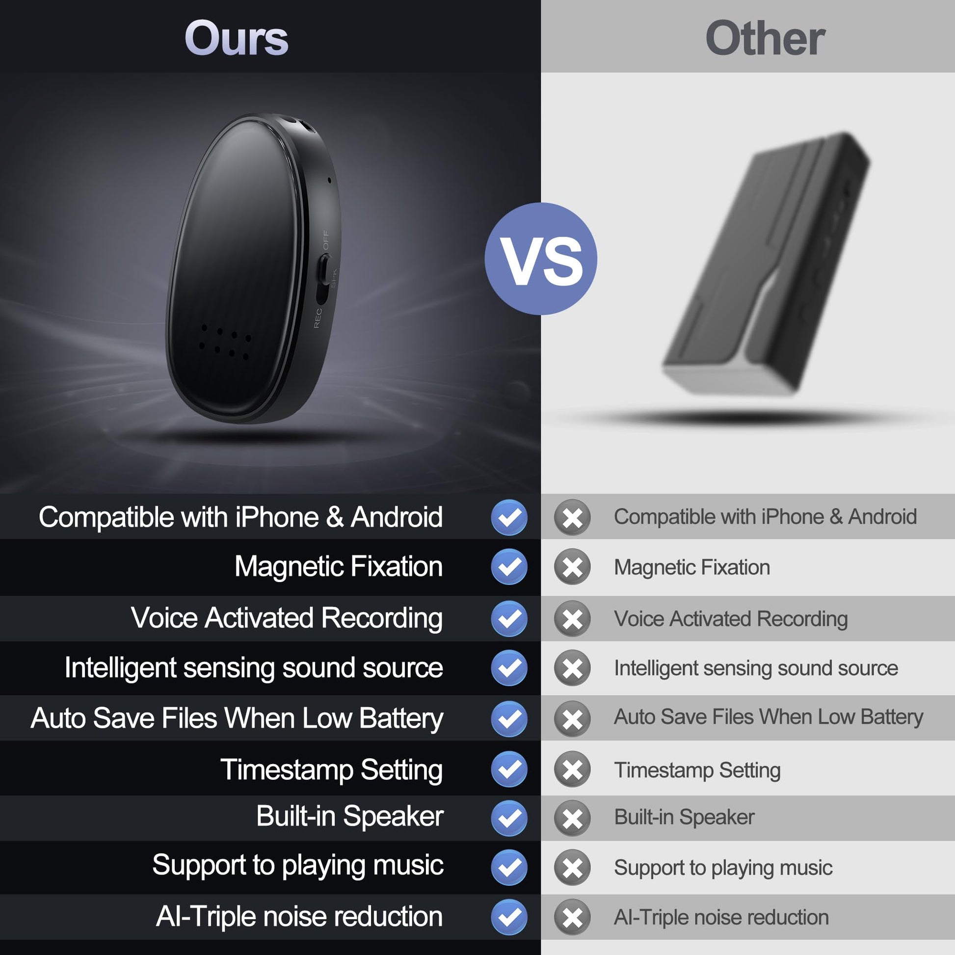 - ⛳All-In-One Voice Recorder: Moresen multi-functional digital voice recorder with one-click fast recording, voice-activated recording, segmented recording,give you more choices,let you can find a more suitable recording method from this voice recorder. Meanwhile, this smart voice recorder also come with MP3 playback,you also can fully enjoy your music via this recorder at anytime and anywhere,audio format support: WMV, MP3, flac,etc.