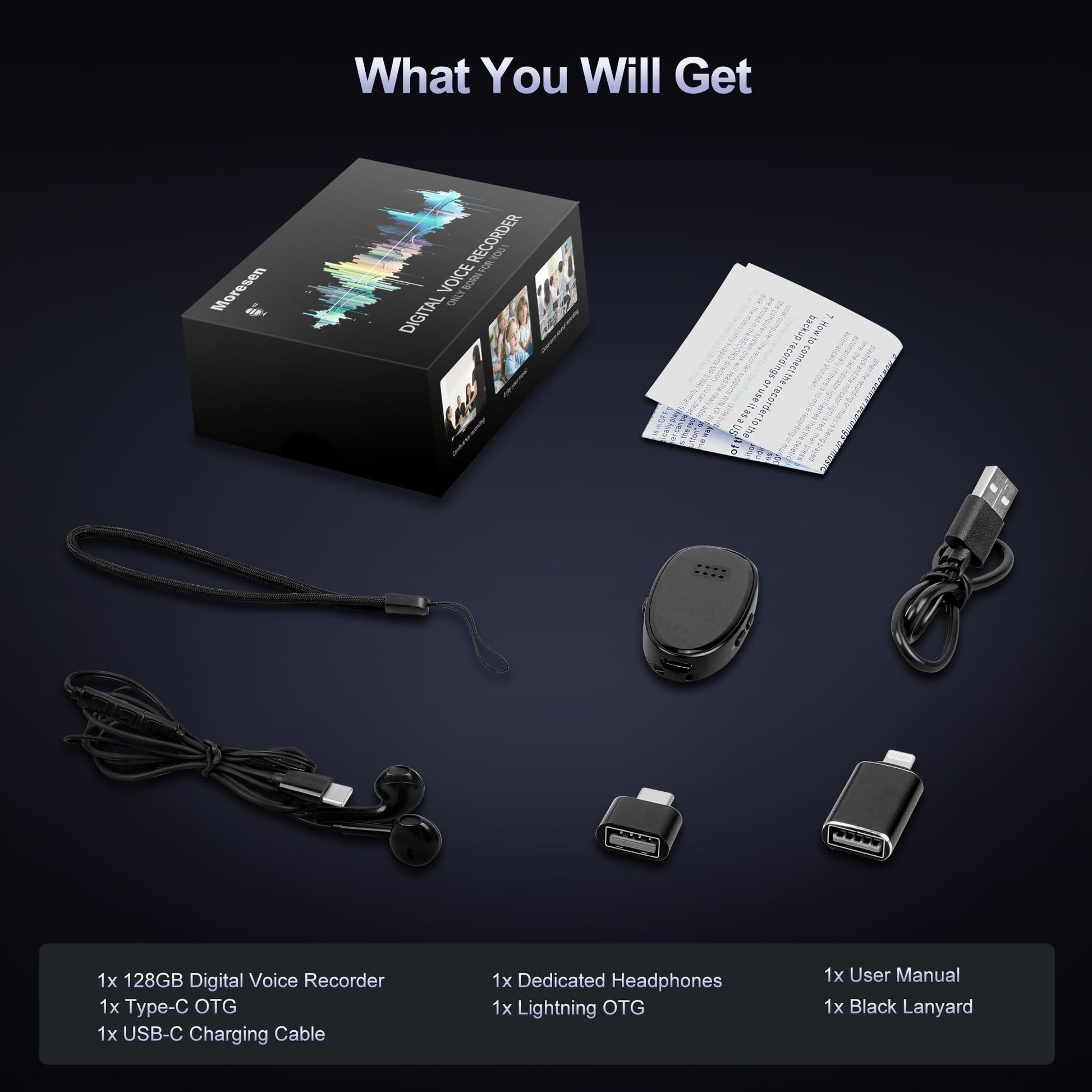 - 🎁What You Will Get:1x 128GB Digital Voice Recorder,1x Headphones,1x Type-C Charging Cable,2x OTG Adapter,1x Black Lanyard,1x User Manual. Note:only the supplied headphone can listen the recording files of this voice recorder, let you can create your own sound world via this recording device!