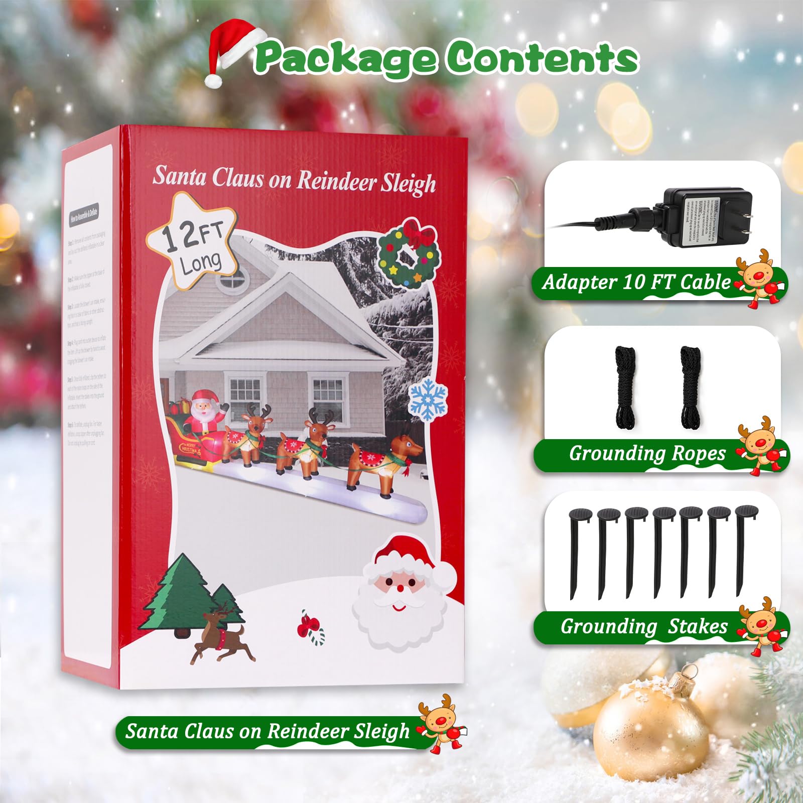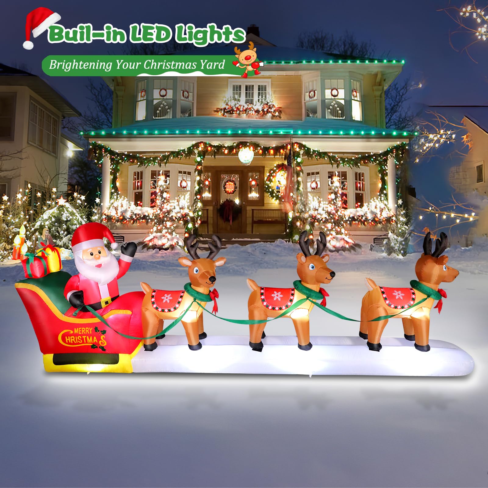 - ๐ Eye-Catching Christmas Decoration: Do you want to add more fun to this Christmas holiday? This beautiful inflatable Christmas outdoor decoration will make your home the talk of the neighborhood this festive season! Santa is sitting on the sleigh happily waving hello to everyone, and the lovely reindeer are running fast to carry Santa to deliver gifts! It is sure to be a hit with all who see it. Add this charming inflatable to your Christmas decorating options today!