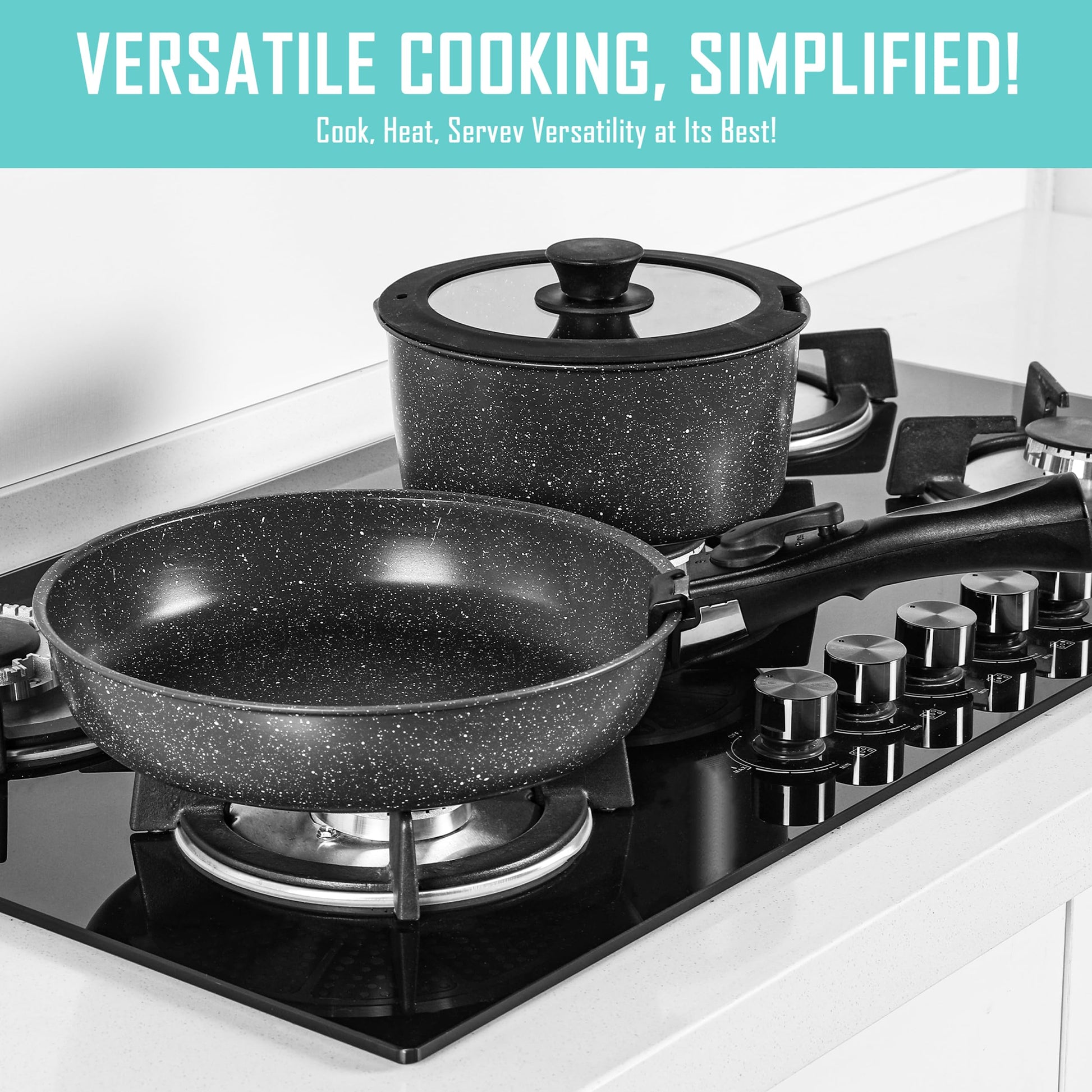 - 🍳 All-in-One Cookware Set – Includes frying pans, saucepans, glass lids, fridge storage lids, and pot protectors — everything you need to prep, cook, and store your favorite meals.