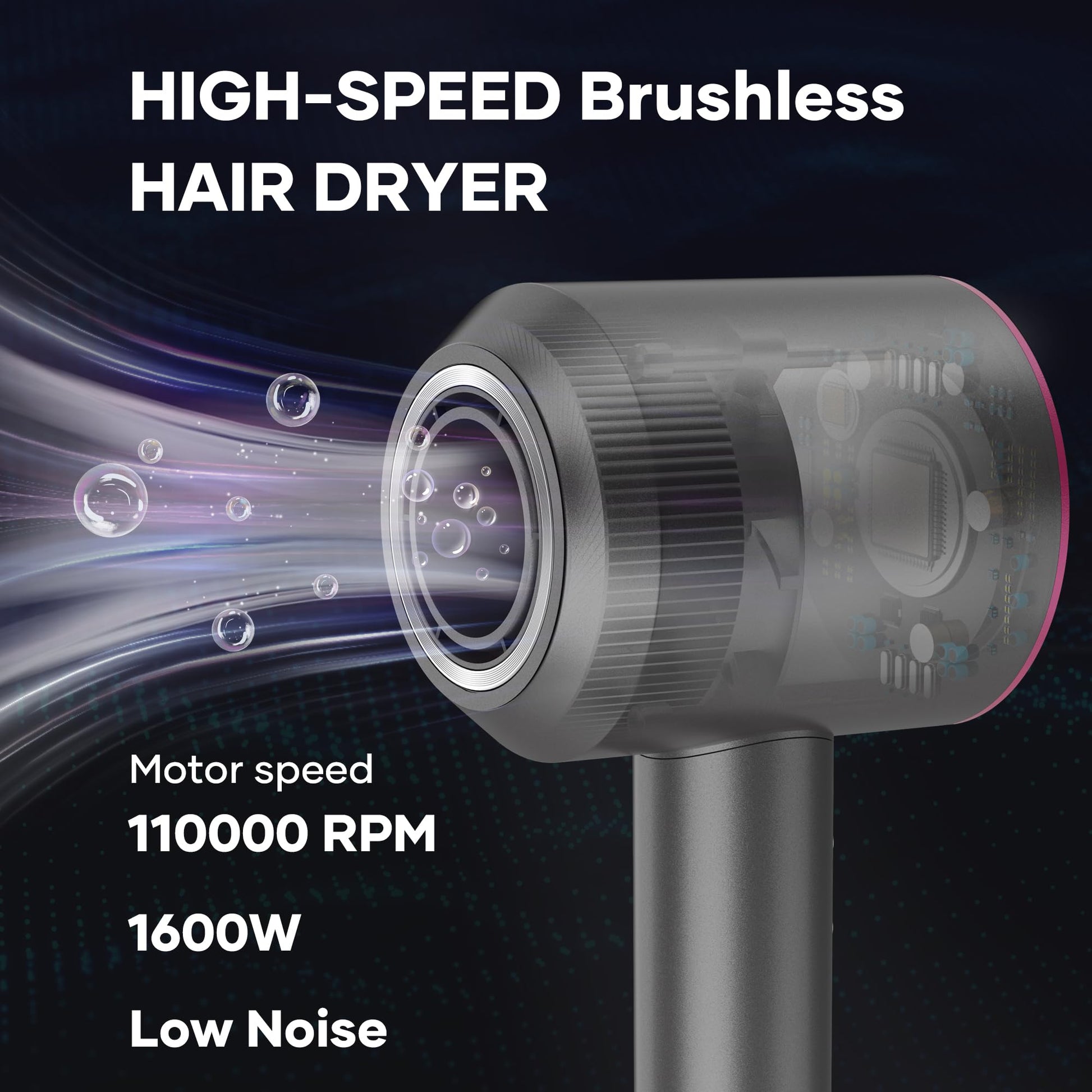 1600W Fast Drying Hair Dryer,Negative Ionic Blow Dryer with High-Speed 110,000 RPM Brushless Powerful Digital Motor,Low Noise Thermo-Control (Rosered-Gray)