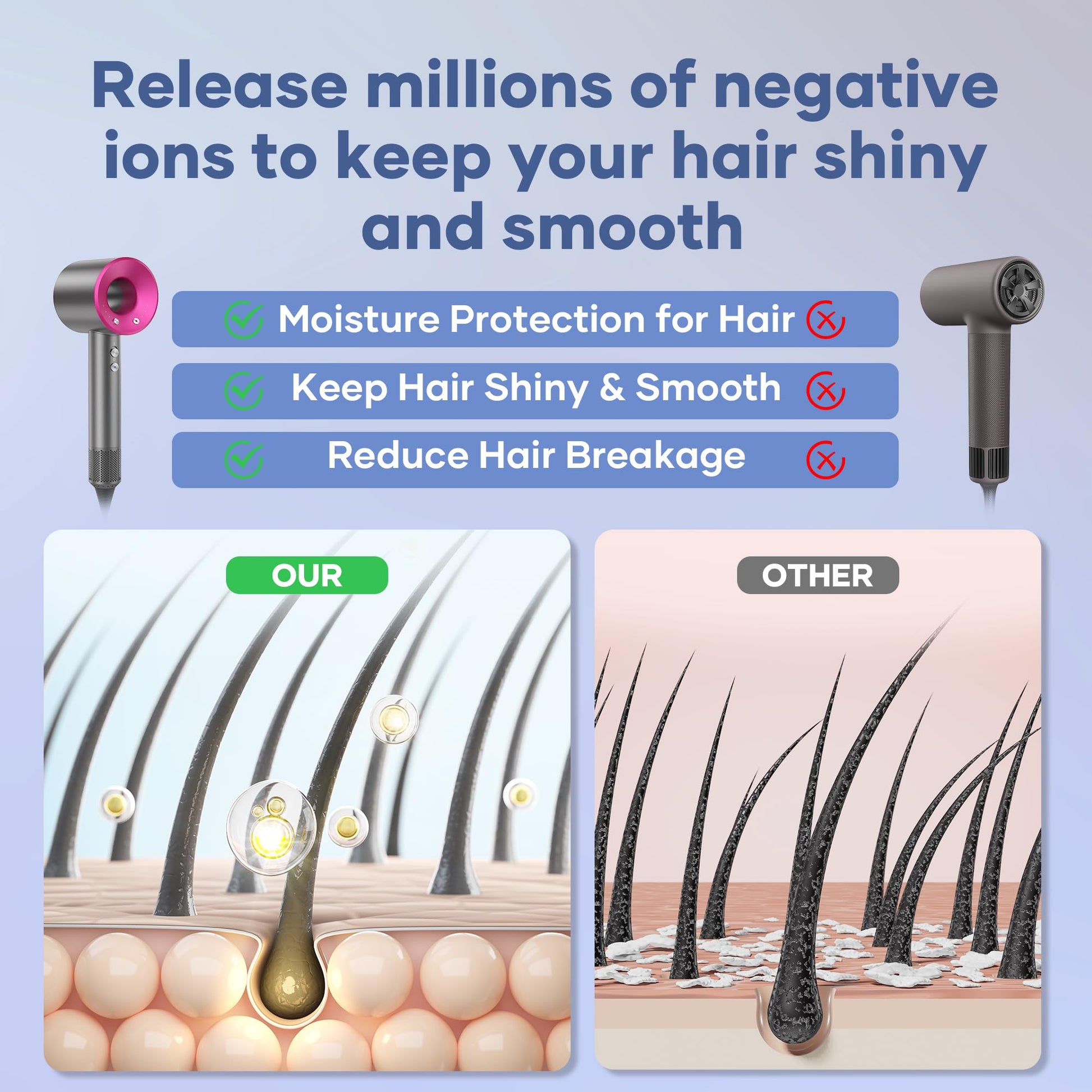 - 【Negative Ionic Technology】 This hair dryer contains 200 million negative ions, which can balance the static electricity in the hair, smooth the frizz, and lock the moisture in the hair at the same time, making the hair soft, fluffy and stylish
