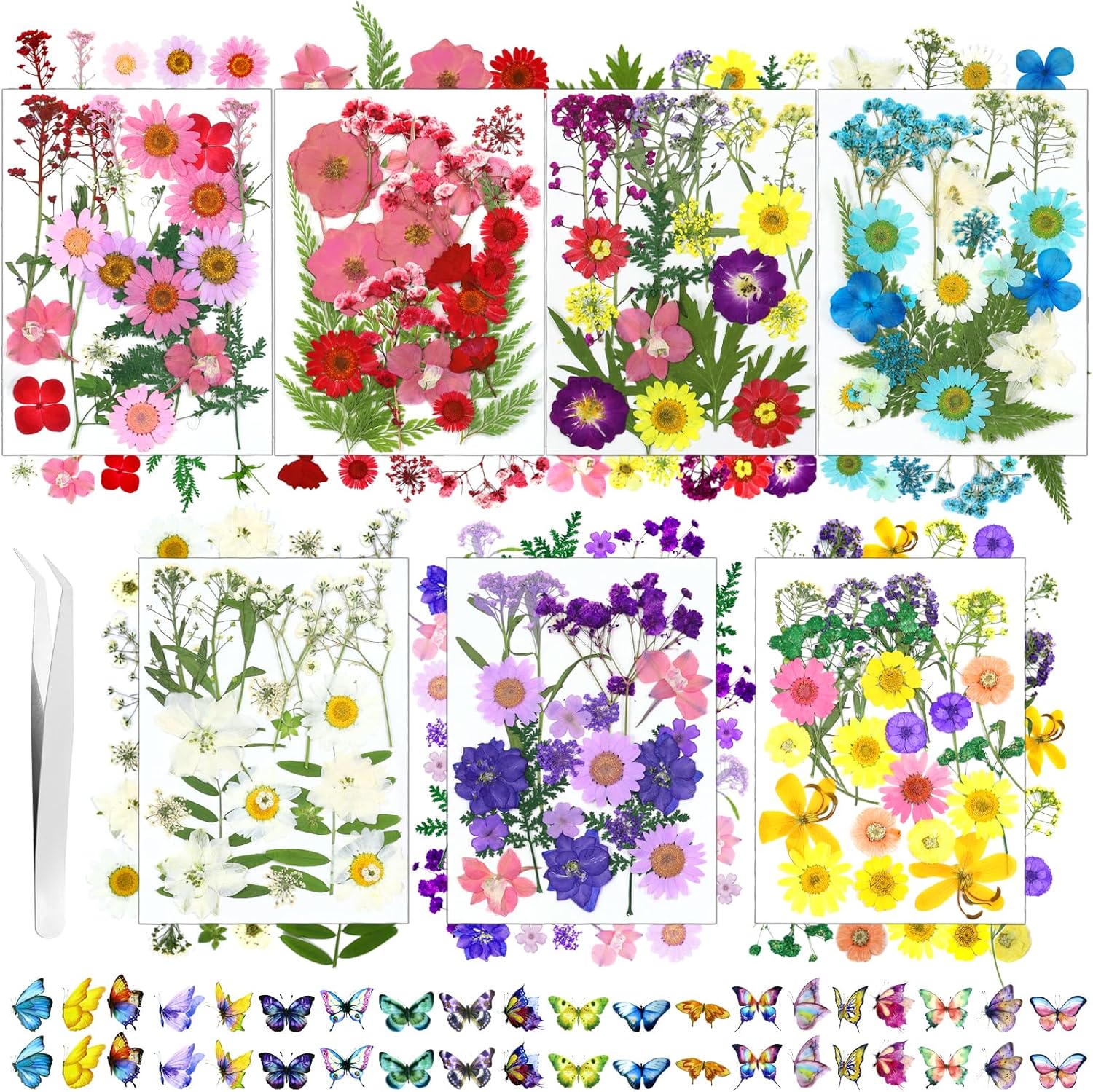 This dry flower set includes 150 pieces of real dry pressed flower and 40 decorative butterflies and 1 tweezers, boasts a diverse range of flower types,different style each dried flower,which can sati