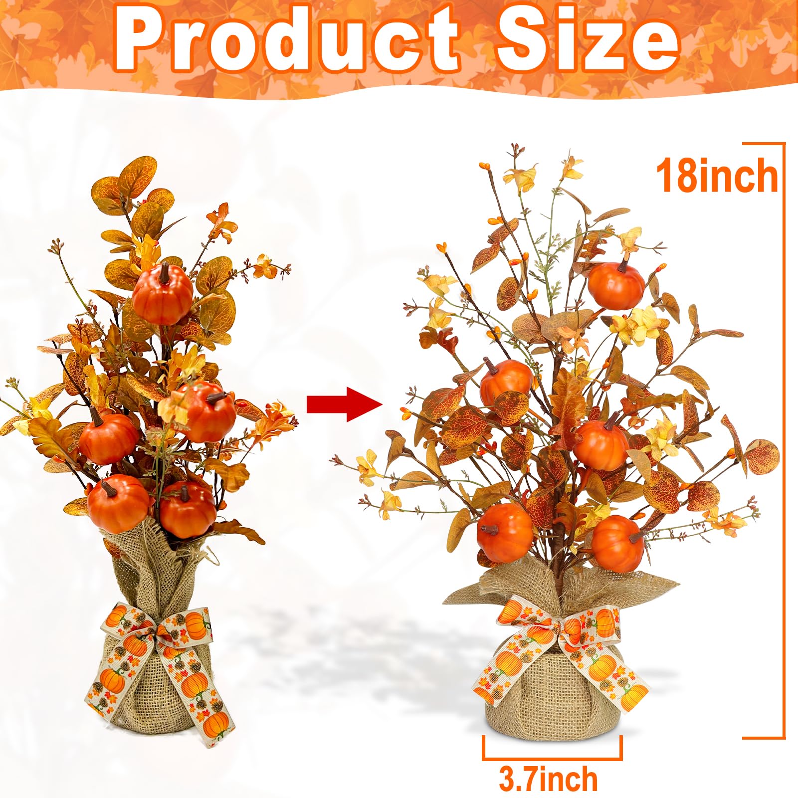 - 2 Pack Lighted Fall Eucalyptus Tree: The package includes 2 pack 18 inch fall eucalyptus trees with warm lights. The fall trees are decorated with eucalyptus leaves, maples leaves, pumpkins, berries, twigs small fall flowers and burlap base