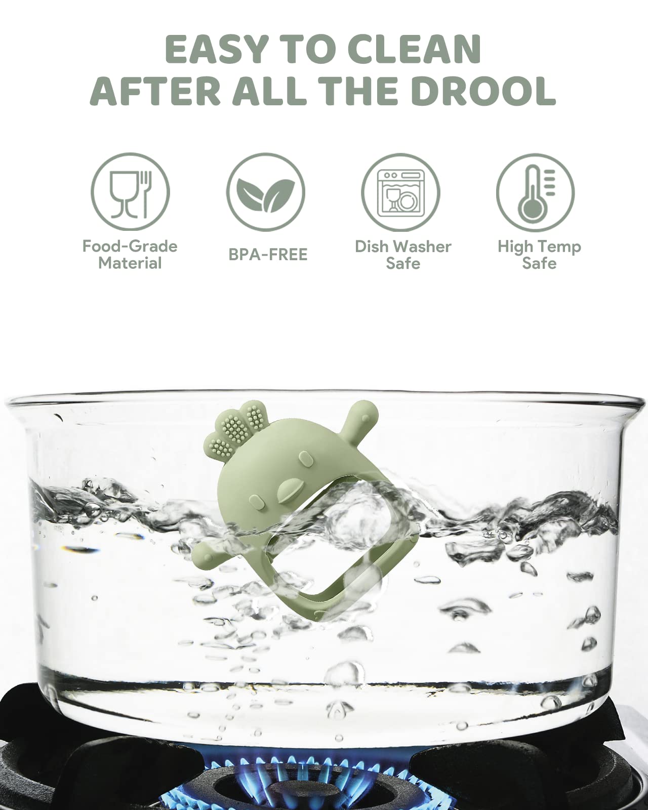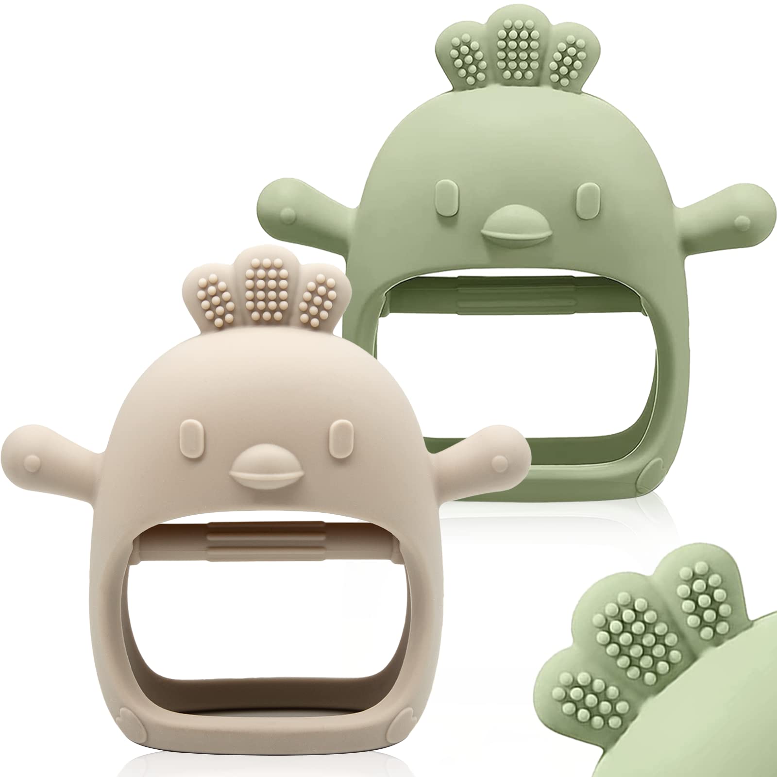 - 【Give your little one a hand with teething】The Silicone Teething Mitten is the perfect solution for babies who aren't yet able to hold onto teethers. The soft silicone mitten fits over little hands, and the inner bar provides extra grip support for babies to grasp. Plus, the mitten protects babies from chewing on their hand—or anything else they could get their teeth on. The character's 'arms' mimic a nipple, helping further soothe fussy little ones.