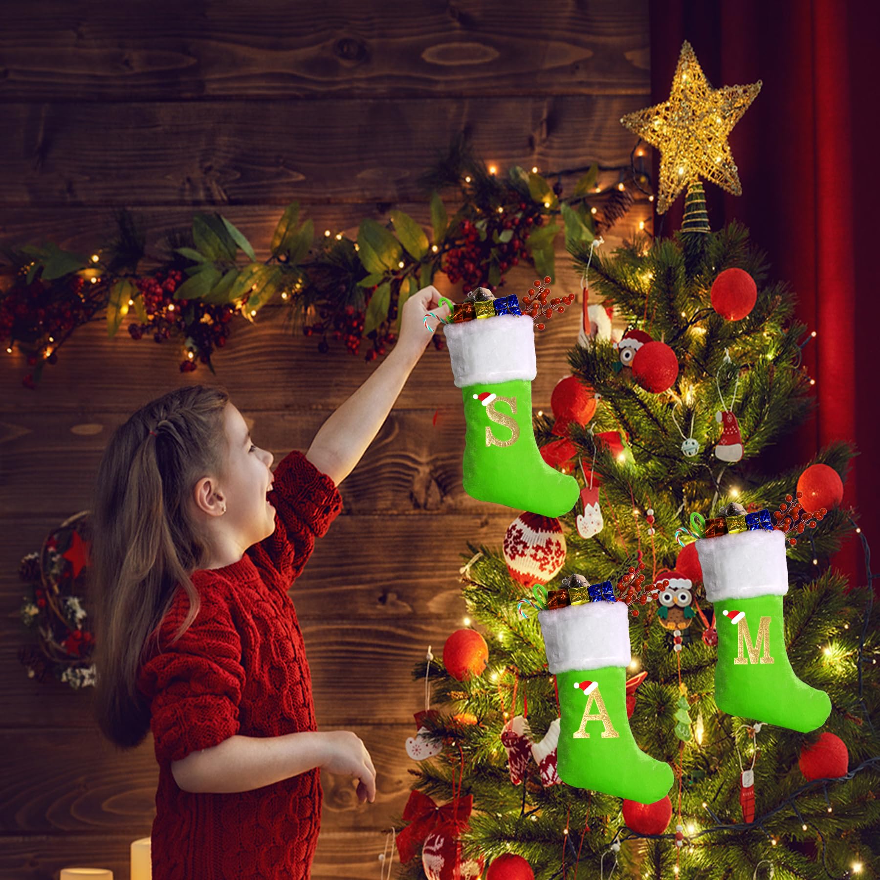 - Perfect Size : The monogrammed christmas stockings with letters has a large top opening and a spacious interior, each christmas stockings with letters is about 20 inches long and 9 inches wide, have 3-inch long hanging ring with a thick and sturdy loop