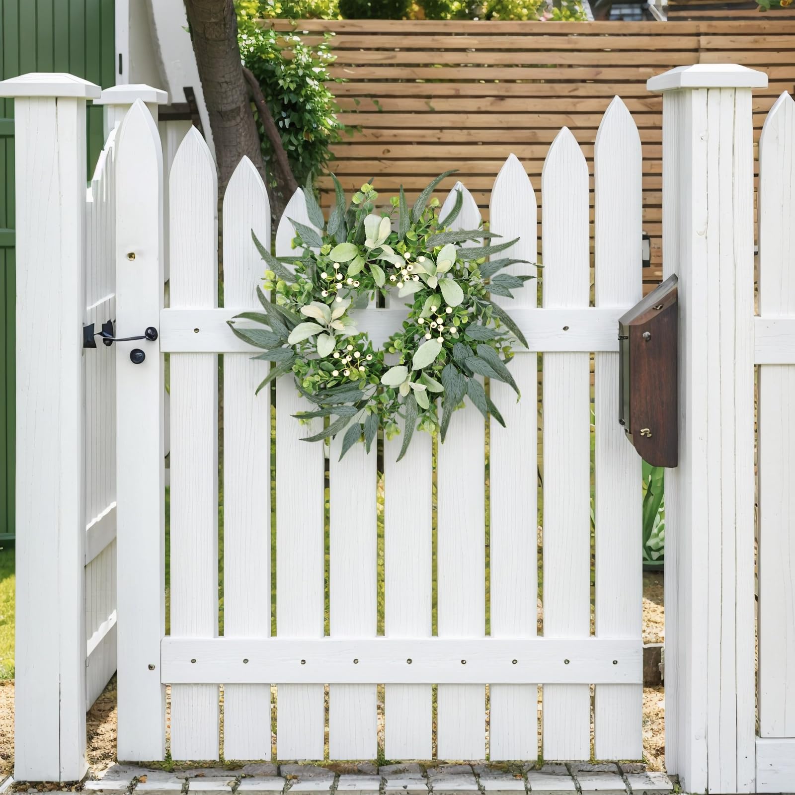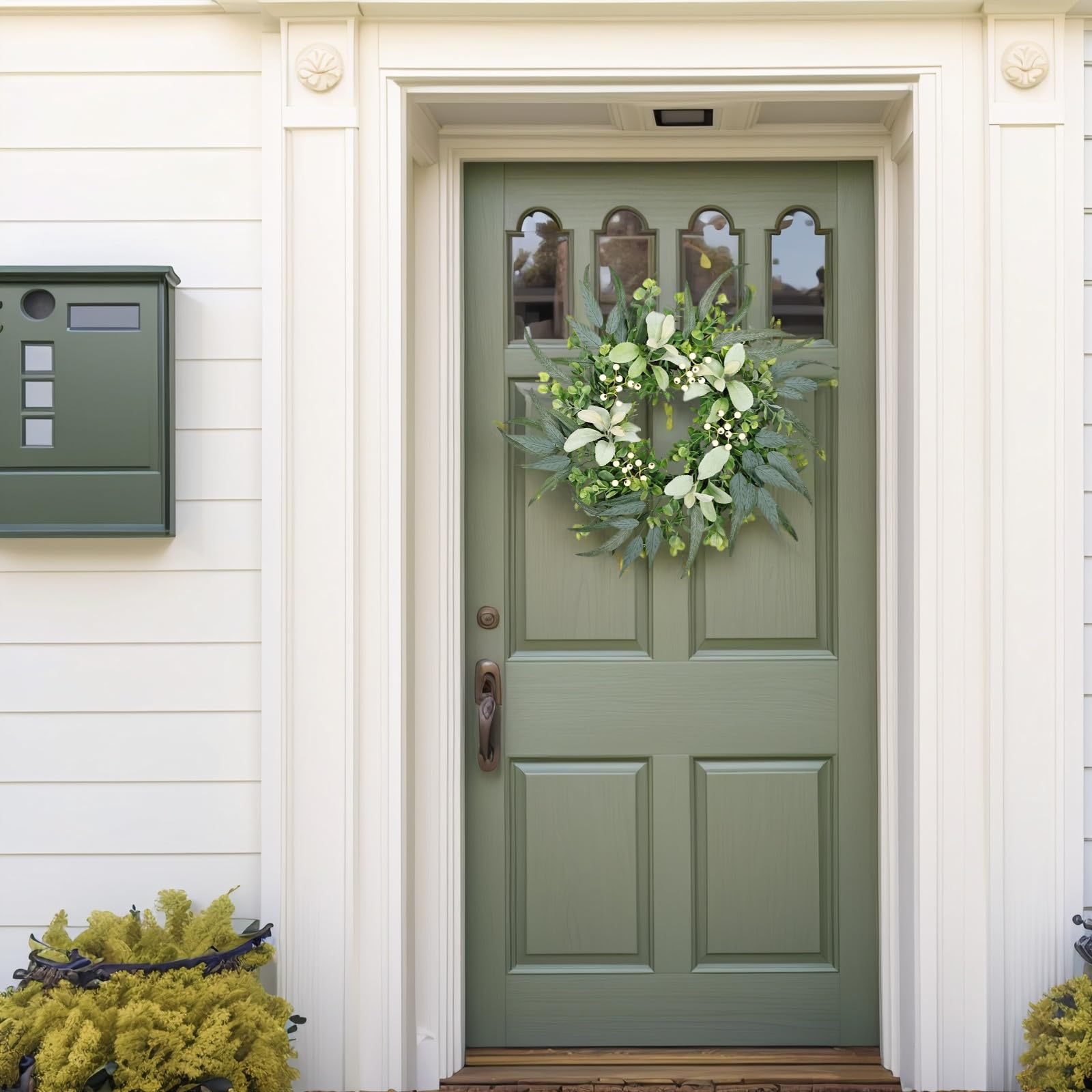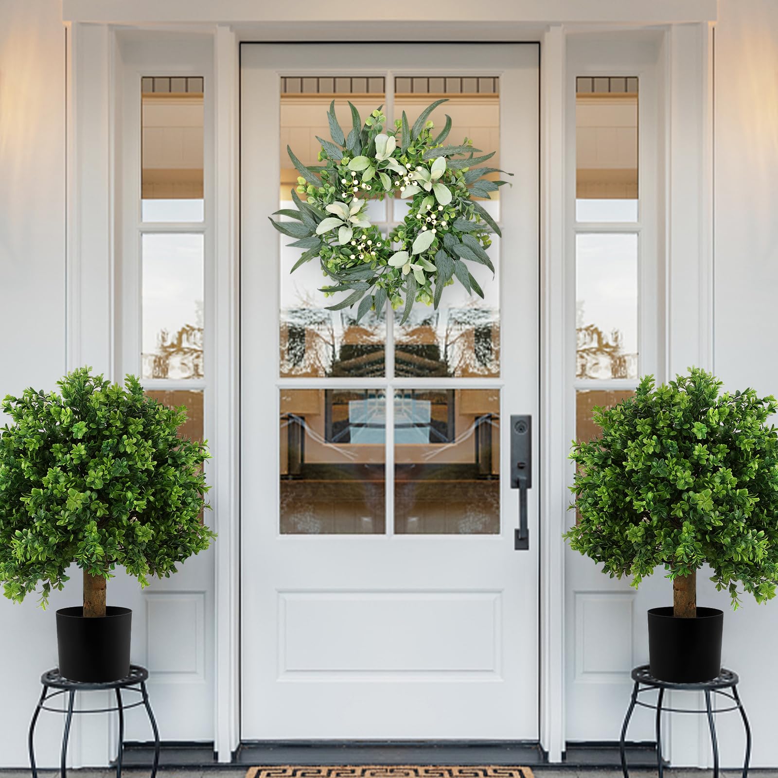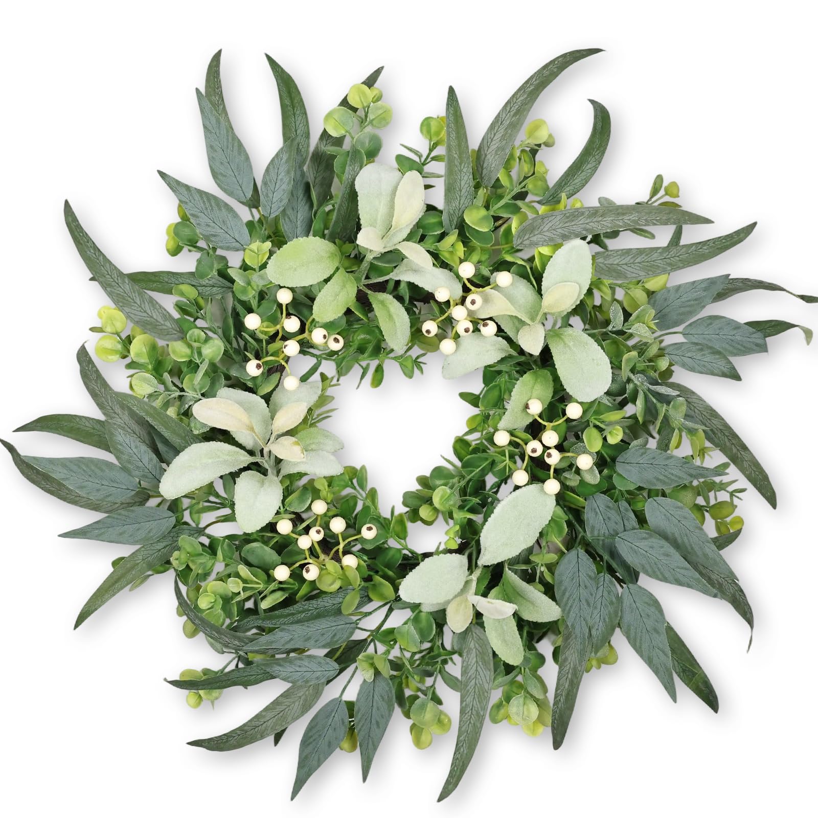 - Lifelike Wreath: The front door wreath is made of 3 different shapes of leaves, including eucalyptus leaves, Lamb’s Ear Leaves, etc. Delicate white eucalyptus berries are accented to bring vibrant, lifelike charm to your space