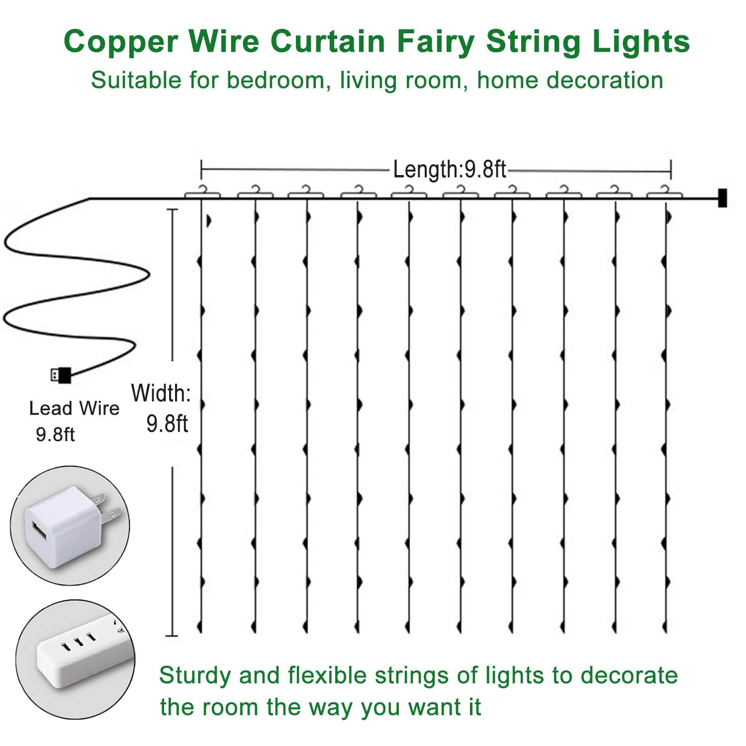 - 【300 LED DECORATION CURTAIN LIGHTS】300pcs super bright flashing lights produce plenty of light volume, dazzling warm and shining glow. The string is made of lightweight copper wire, and the hook on each curtain string is mainly used for hooking curtains, this curtain string light (curtains not included) is perfect for home curtains, walls, and indoor and outdoor decoration. Full accessories and installation at will.