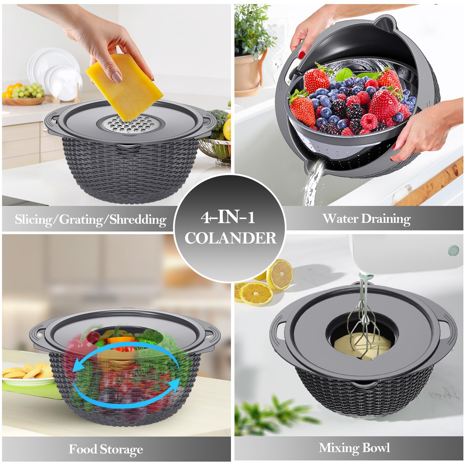Details: 4-1 Colander with Mixing Bowl Set - Kitchen Strainers 4-1 Colander with Mixing Bowl Set, Strainers with Vegetable Slicer for Kitchen, Food Strainers and Colanders for Pasta and Rice, Fruit and Veggie Washing Basket, Salad Spinner, Apartment & Home Essentials for Cleaning, Slicing and Kneading Versatile 4-in-1 Kitchen Essential Great Addition Our colander with mixing bowl set is the ultimate tool for washing, straining, slicing, and kneading. Say goodbye to multiple kitchen gadgets and simplify your cooking routine! Grate or slice your items right into the colander using the removable graters/blades. Easy to use and clean up easily. Mixing bowls come with large pour spouts on the front and back to make pouring a smooth and no splash. Multi-functional colanders and mixing bowls are the faultlesstool for cooking in the kitchen, easily helping you to simplify the preparation of ingredients and the cooking process. Wash, strain, clean, slice and shred in one bowl! Good construction, sturdy design. Works well, very handy!
