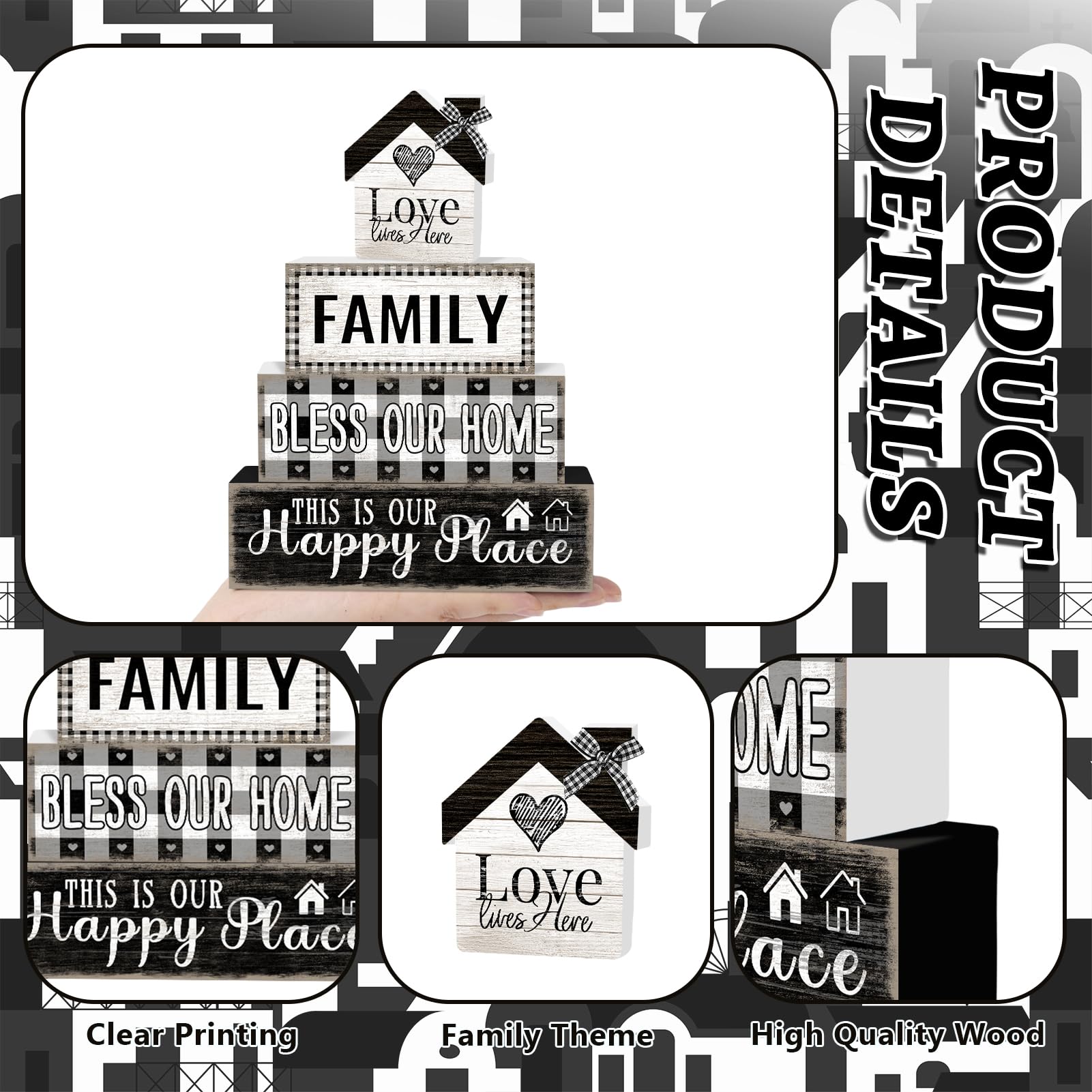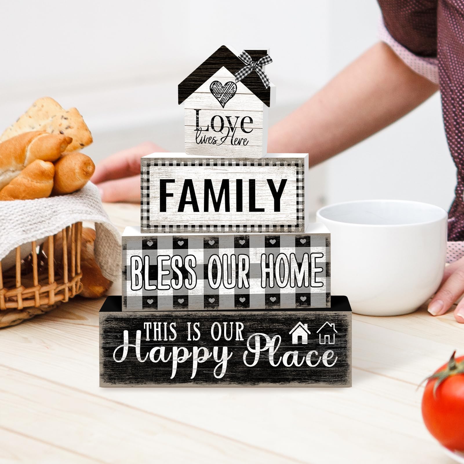 4 Pcs Farmhouse Family Wooden Tiered Tray Decor Set, Rustic Bless Our Home Wood Table Decor Buffalo Plaid Distressed Stack Block Signs Tabletop Centerpieces for Home Kitchen Shelf Mantle Decorations