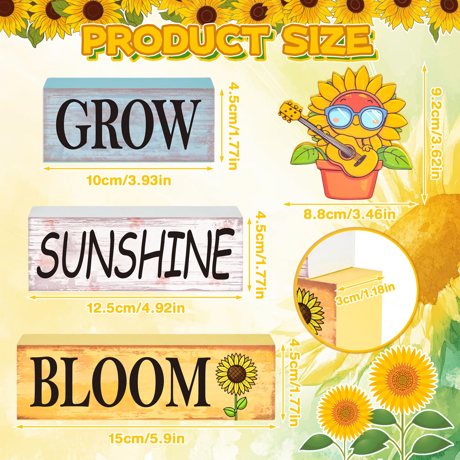 - 【Blooming Guitarists】A Layered Wooden Composition: Three Text-Carved Blocks Elevate a Radiant Artificial Sunflower Guitarist. Sunflower Decor Transforms Shelves into a Summer Stage for Botanical Melodies