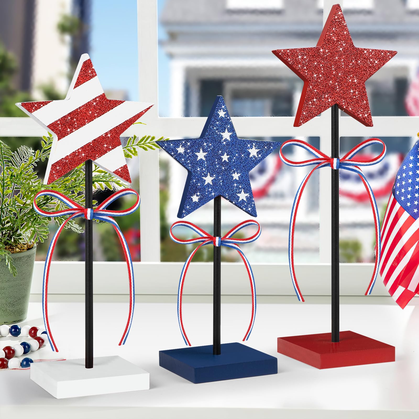- Independence Day Decorations: This set of wooden star stands features a double-sided printed design in red, white and blue with a beautiful ribbon, perfect for celebrating Independence Day and echoing your patriotic sentiments.