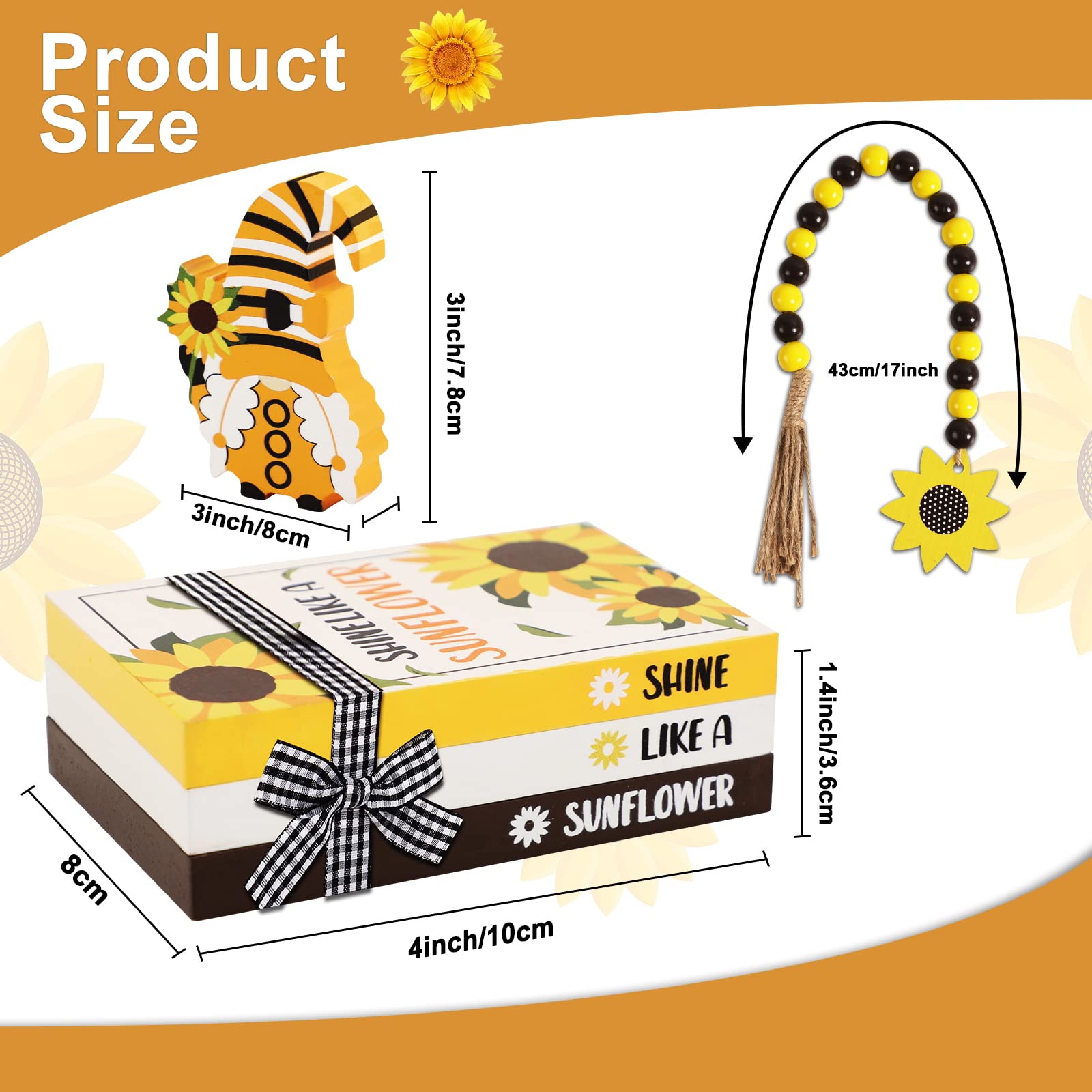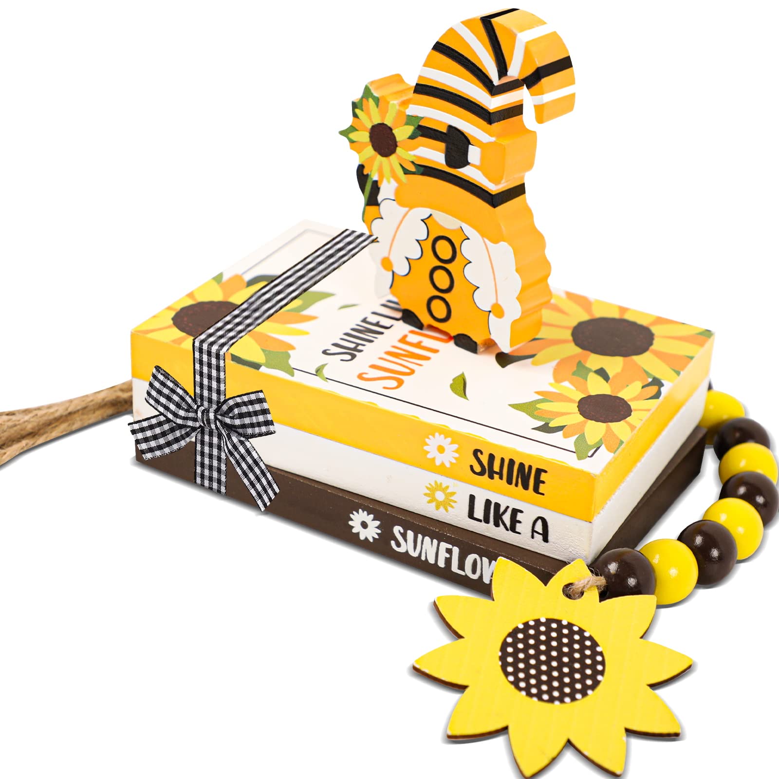 - 【sunflower Table Sign】Our summer sunflower wooden table sign includes 5 pieces summer signs in different styles include 3pc fake book signs, 1pc yellow sunflower gnome sign, 1pc wood bead garland with tassels, the enough quantity can meet your summer decoration. Decorate your home this holiday, starting with this practical double-sided wooden decor!