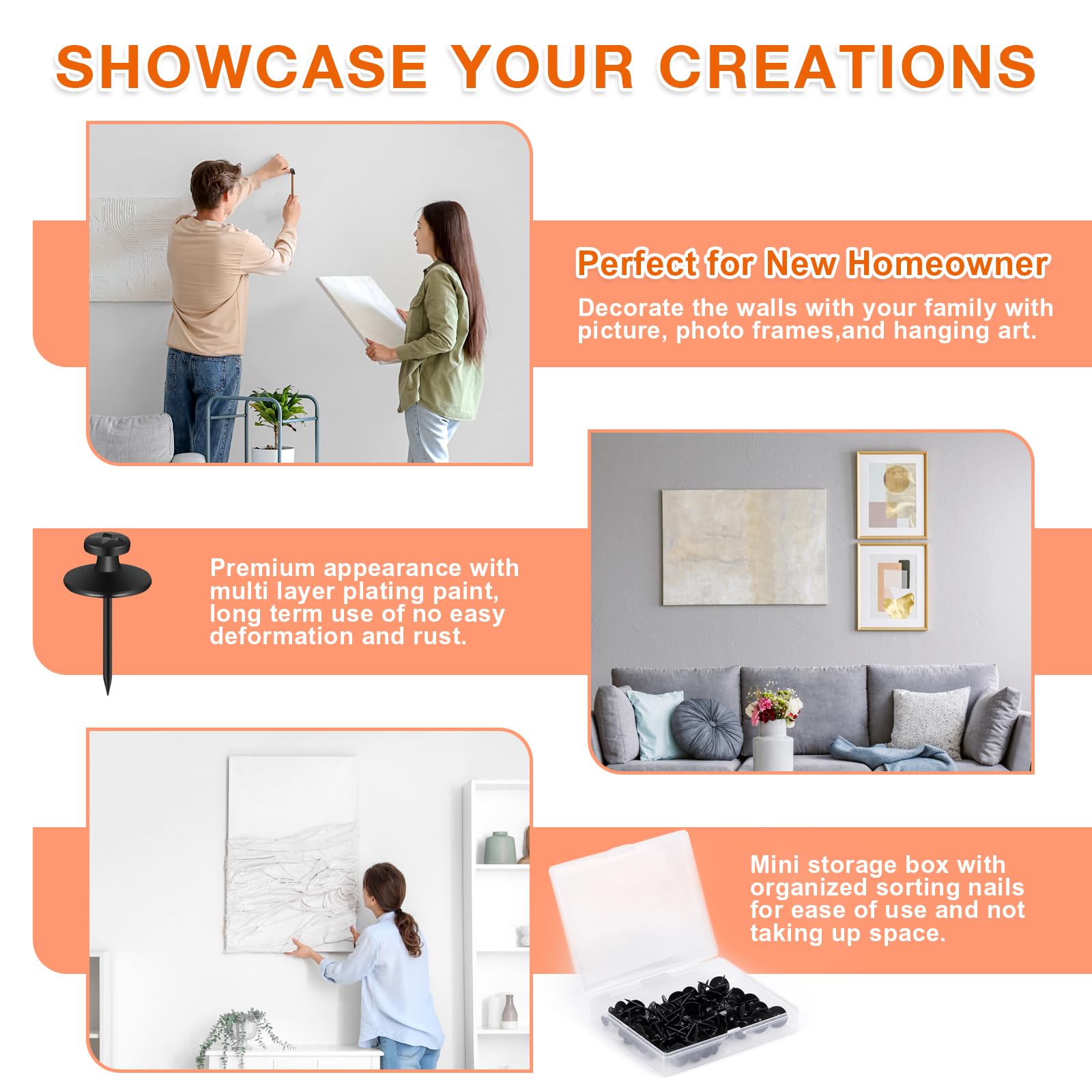 - THUMBTACKS FOR STABLE STRUCTURE: The picture hanging kit are designed with double heads, and the second head provides strong support for the nails for hanging pictures, making it easier to hang heavier objects on the wall without slipping or falling off. Each wall nails for hanging can safely support up to five pounds.