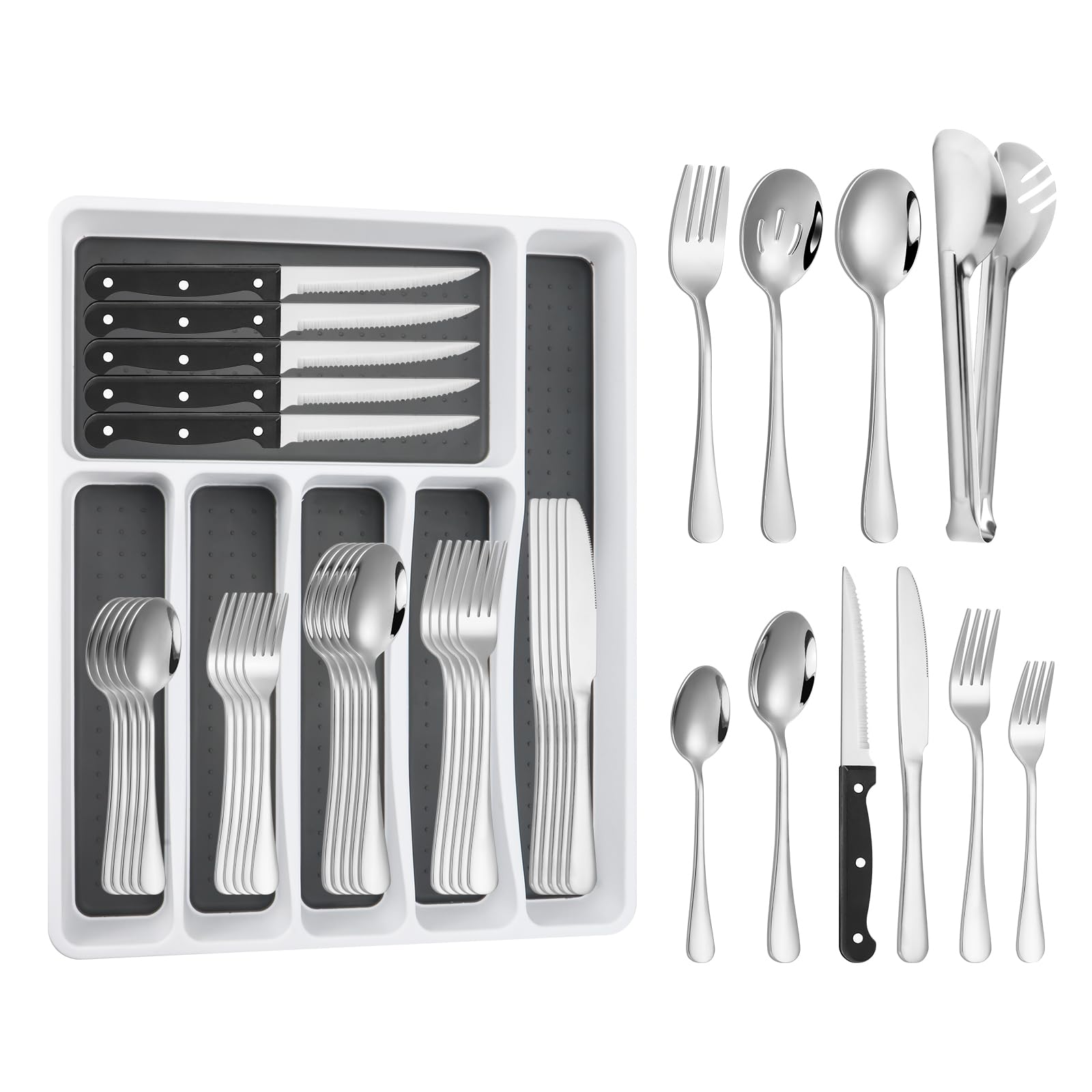 53PCS Silverware Set for 8 with Flatware Drawer Organizer, Stainless Steel Cutlery Set with Steak Knives, Include Spoons and Forks Set & Serving Utensils, Mirror Polished, Silver