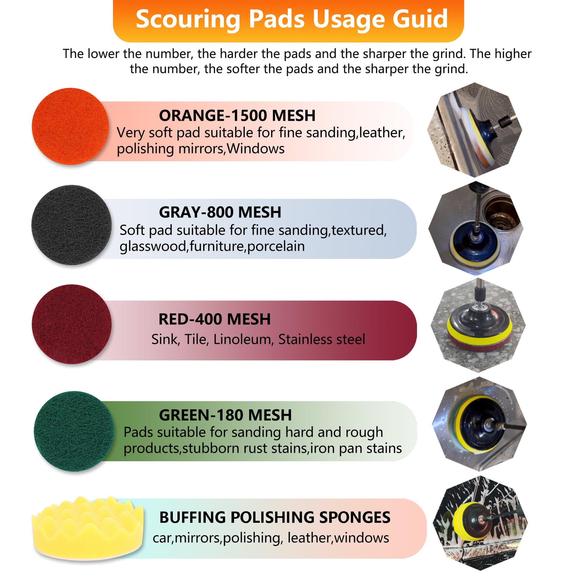 - Drill Brush Attachment Set: 55pcs drill brush set including 1pcs Cordless electric screwdriver(Not including screwdriving bits),28pcs 4'' scrubbing pads(Including four different hardness levels, Green>Red>Gray>Orange),11pcs cleaning brush(Brushes can clean floors, crevices, toilets, cars, glass, barbecue grills, etc),9pcs 4'' scrub sponge,2pcs 4'' Wool polishing pad,1pcs back,1 pcs Extension rod.