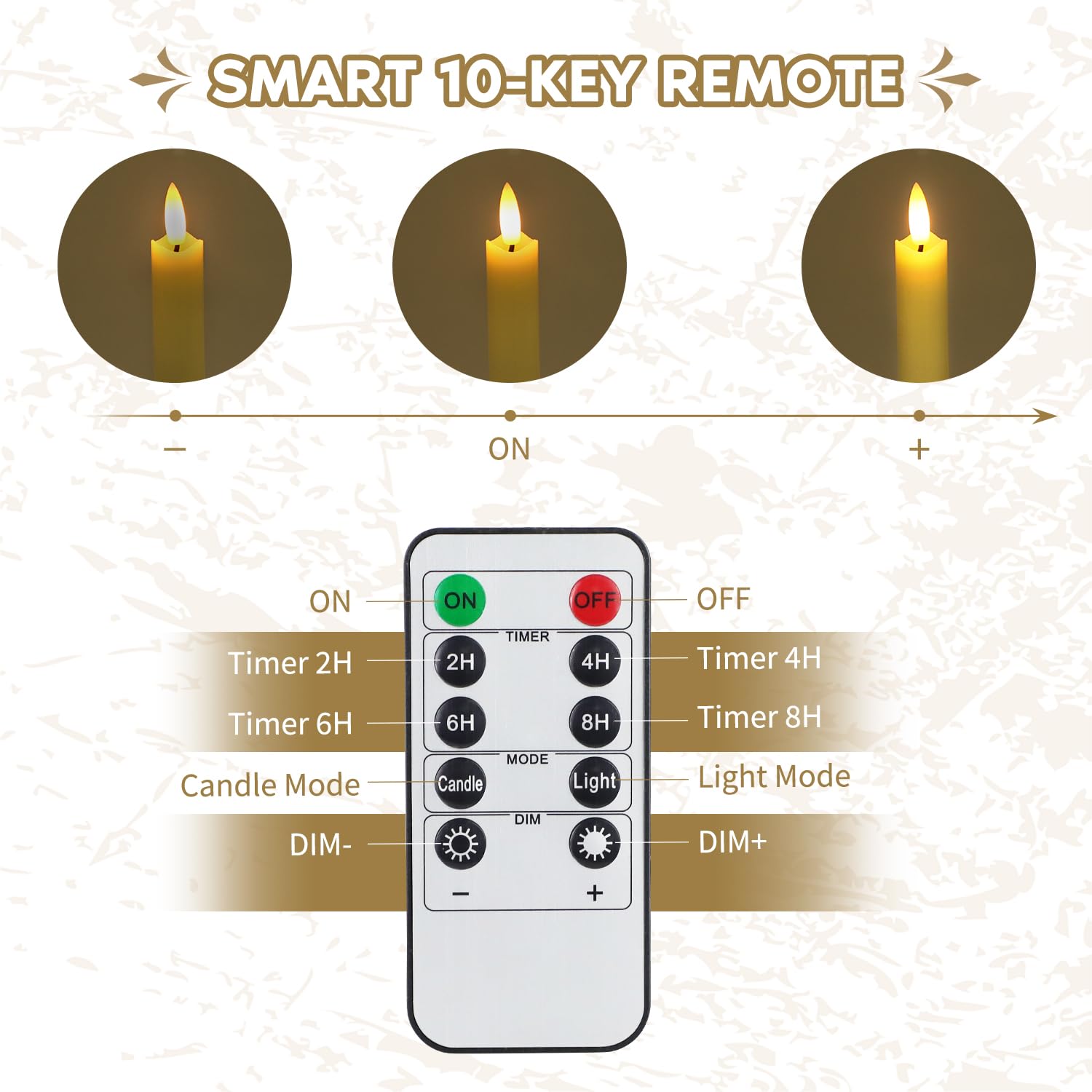 - 【Package and Service】: Each package contains 6*candles, 6*candle holders, and 2*10-key remotes. Each battery power taper candle is thoroughly and rigorously tested before sale, Avoid using it in a high-temperature environment. If any problems during use, please contact our Customer Support Team and the problem will be resolved as soon as possible.