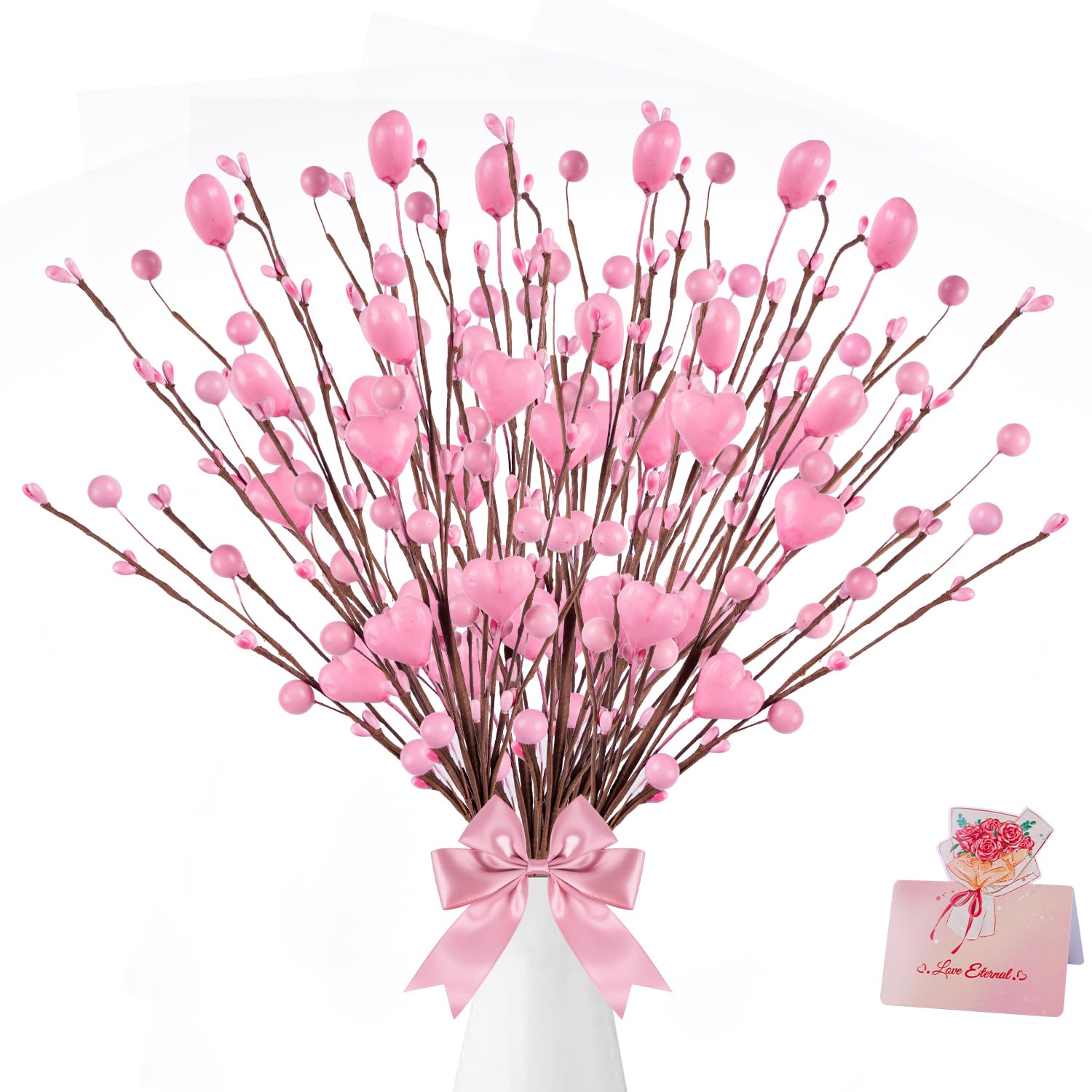 6 Pcs Valentine’s Day Gifts, Artificial Berry Flower Stems with Pink Heart Shaped Berry Picks with Message Card for Valentine’s Day Chrismas Decor, Propose Wedding Anniversary Decorations