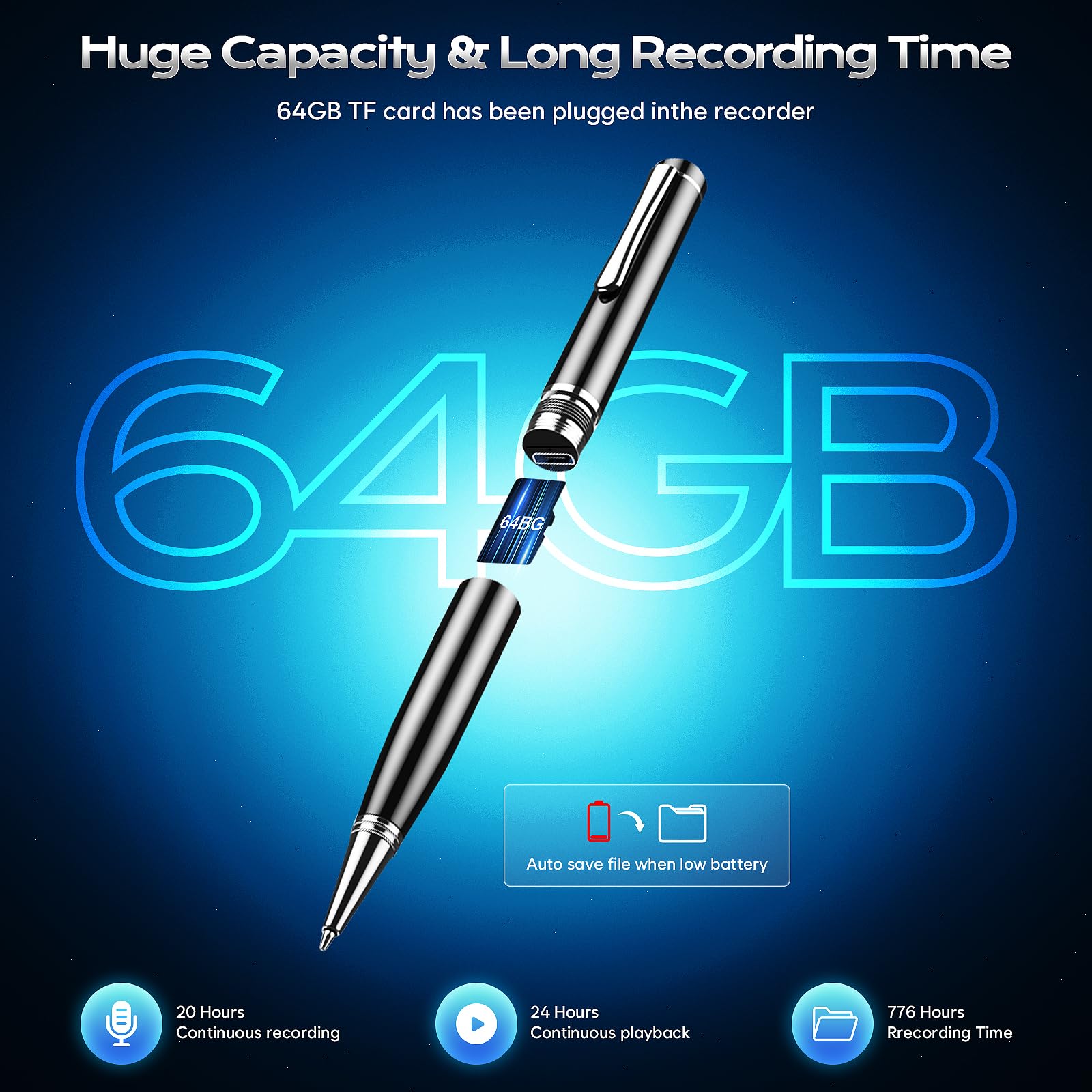 - What's in the Box - This digital voice recorder is comes with a full accessaries: Recorder*1, 64 GB TF card*1, 3.5mm headphones*1, Micro-USB cable*1, controller*1, replacement refill*5, screwdriver*1, manual*1