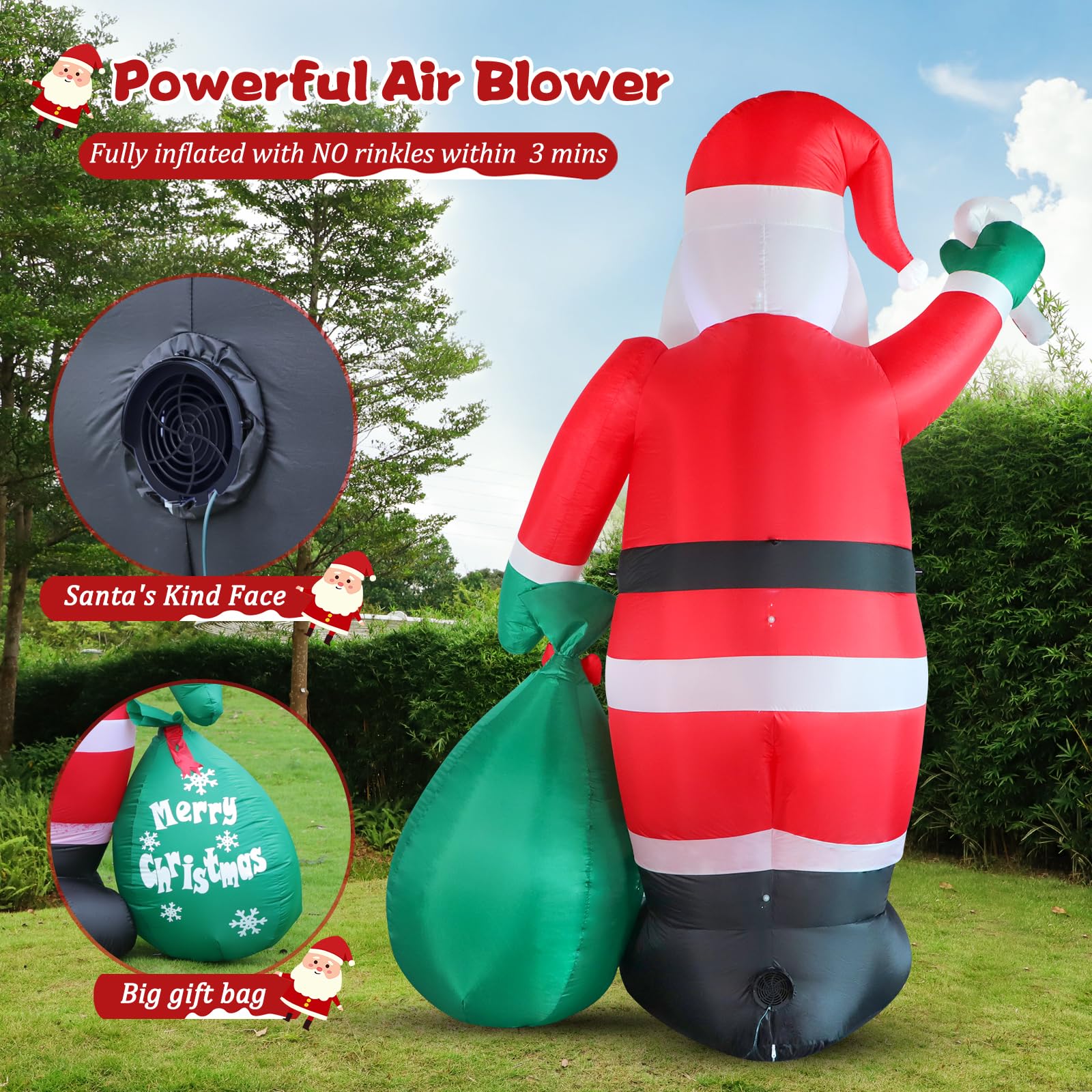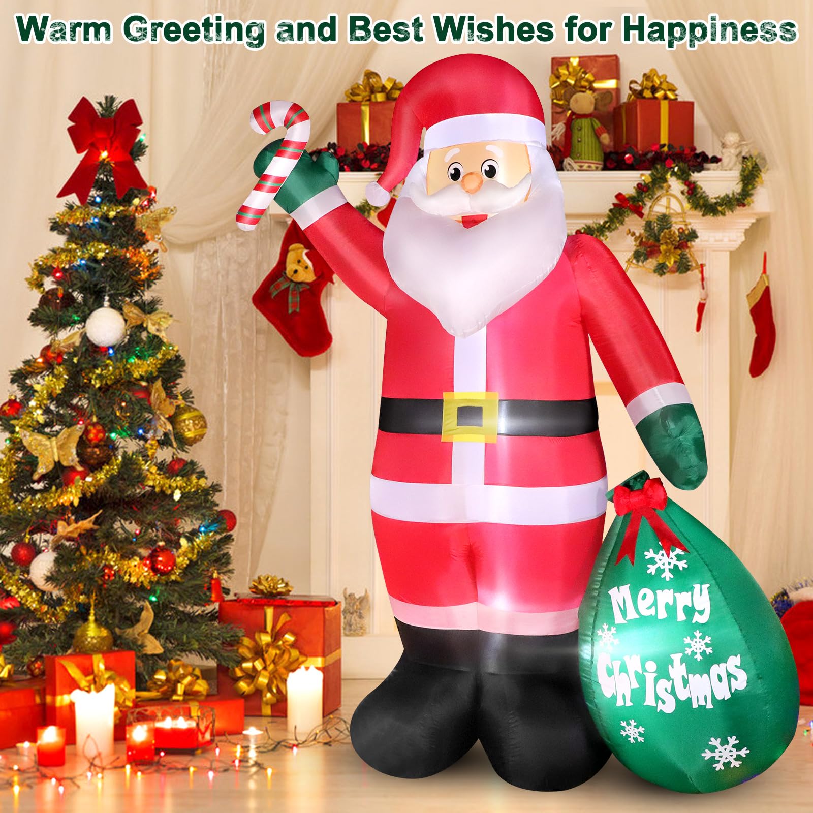 - đăPerfect for Christmas DecorăThe 6Ft Christmas inflatable Santa Claus with candy and a large green Merry Christmas gift bag happily waves to everyone, bringing the greatest Christmas atmosphere. In addition, the built-in bright LED lights will light up the yard festively which is perfect for a Christmas night party, no matter whether it is indoor or outdoor, day or night, in rain or snow, it always gives you a beautiful and memorable Xmas holiday!