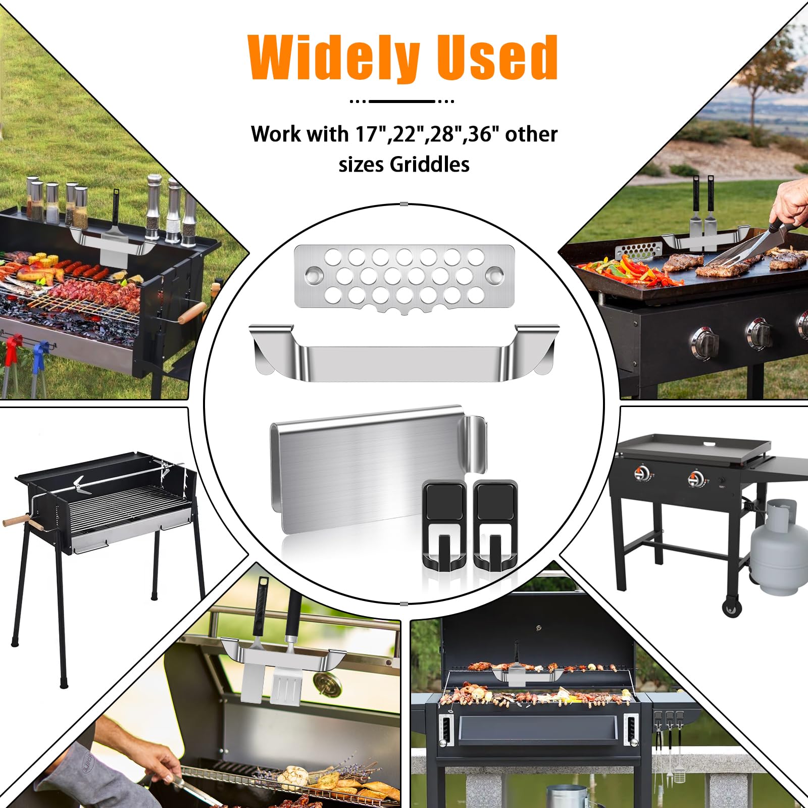 - 6-in-1 Versatile Griddle Accessories Set: Griddle Accessories Set includes Griddle Spatula Holder*1, Magnetic Griddle Grease Gate*1, Sliding Grease Gate*1, Magnetic Hooks*3, Bring you a new barbecue experience! these accessories are durable, rust-proof, and easy to clean. Griddle accessories set can stop food from escaping and clogging the hose while grilling, organize a variety of shovel tools